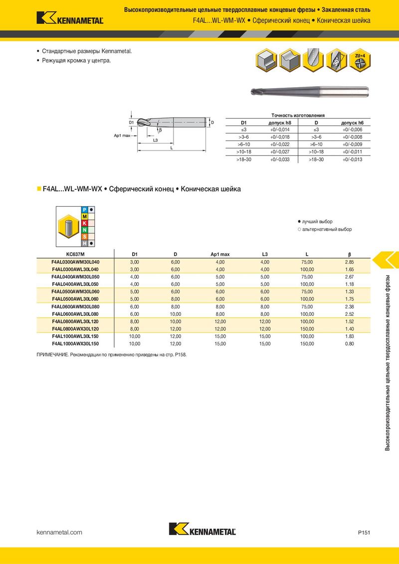Высокопроизводительные цельные твердосплавные концевые фрезы • Закаленная сталь F4AL...WL-WM-WX • Сферический конец • Коническая шейка • Стандартные размеры Kennametal. • Режущая кромка у центра. Tочность изготовления D1 допуск h8 D допуск h6 )3 +0/-0,014 )3 +0/-0,006 >3–6 +0/-0,018 >3–6 +0/-0,008 >6–10 +0/-0,022 >6–10 +0/-0,009 >10–18 +0/-0,027 >10–18 +0/-0,011 >18–30 +0/-0,033 >18–30 +0/-0,013 F4AL...WL-WM-WX • Сферический конец • Коническая шейка ⅷ лучший выбор ࠗ альтернативный выбор KC637M D1 D Ap1 max L3 L ` F4AL0300AWM30L040 3,00 6,00 4,00 4,00 75,00 2.85 F4AL0300AWL30L040 3,00 6,00 4,00 4,00 100,00 1.65 F4AL0400AWM30L050 4,00 6,00 5,00 5,00 75,00 2.67 Высокопроизводительные цельные твердосплавные концевые фрезы F4AL0400AWL30L050 4,00 6,00 5,00 5,00 100,00 1.18 F4AL0500AWM30L060 5,00 6,00 6,00 6,00 75,00 1.33 F4AL0500AWL30L060 5,00 8,00 6,00 6,00 100,00 1.75 F4AL0600AWM30L080 6,00 8,00 8,00 8,00 75,00 2.38 F4AL0600AWL30L080 6,00 10,00 8,00 8,00 100,00 2.52 F4AL0800AWL30L120 8,00 10,00 12,00 12,00 100,00 1.52 F4AL0800AWX30L120 8,00 12,00 12,00 12,00 150,00 1.40 F4AL1000AWL30L150 10,00 12,00 15,00 15,00 100,00 1.83 F4AL1000AWX30L150 10,00 12,00 15,00 15,00 150,00 0.80 ПРИМЕЧАНИЕ. Рекомендации по применению приведены на стр. P158. kennametal.com P151