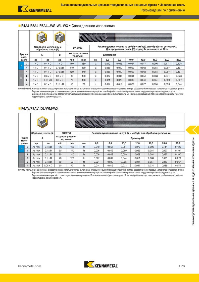 Высокопроизводительные цельные твердосплавные концевые фрезы • Закаленная сталь Рекомендации по применению F4AJ-F5AJ-F6AJ...WS-WL-WX • Сверхдлинное исполнение Обработка уступов (A) и KC633M Рекомендуемая подача на зуб (fz = мм/зуб) для обработки уступов (A). обработка пазов (B) Для прорезания пазов (B) подачу fz уменьшите на 20%. Группа A B скорость резания Диаметр D1 мате- vc, м/мин риала ap ae ap min max мм 6,0 8,0 10,0 12,0 16,0 20,0 25,0 P 3 1xD 0,4 x D 1xD 160 180 fz 0,040 0,055 0,067 0,077 0,096 0,111 0,125 4 1xD 0,4 x D 0,75 x D 140 160 fz 0,036 0,049 0,059 0,069 0,084 0,097 0,107 1 1xD 0,4 x D 0,75 x D 120 140 fz 0,036 0,049 0,059 0,069 0,084 0,097 0,107 H 2 1xD 0,3 x D 0,5 x D 80 130 fz 0,027 0,037 0,044 0,051 0,063 0,071 0,078 3 1xD 0,15 x D 0,3 x D 70 100 fz 0,021 0,029 0,035 0,041 0,051 0,059 0,067 4 1xD 0,1 x D 0,15 x D 50 70 fz 0,014 0,019 0,023 0,027 0,034 0,039 0,044 ПРИМЕЧАНИЕ. Нижнее значение скорости резания используется при выполнении операций со съемом большого припуска или при обработке более твердых материалов в пределах группы. Верхнее значение скорости резания используется при выполнении операций чистовой обработки или при обработке менее твердых материалов в пределах группы. Верхние значения скоростей соответствуют идеальным условиям. При использовании фрез диаметром >12 мм на обрабатывающих центрах невысокой мощности требуется корректировка режимов резания. F6AV/F8AV..DL/WM/WX Обработка уступов (A) KC637M Рекомендуемая подача на зуб (fz = мм/зуб) для обработки уступов (A). Группа A скорость резания Диаметр D1 Высокопроизводительные цельные твердосплавные концевые фрезы мате- vc, м/мин риала ap ae min max мм 6,0 8,0 10,0 12,0 16,0 20,0 25,0 P 3 Ap max 0,1 x D 120 160 fz 0,040 0,055 0,067 0,077 0,096 0,111 0,125 4 Ap max 0,1 x D 90 150 fz 0,036 0,049 0,059 0,069 0,084 0,097 0,107 1 Ap max 0,1 x D 80 140 fz 0,036 0,049 0,059 0,069 0,084 0,097 0,107 H 2 Ap max 0,1 x D 70 120 fz 0,027 0,037 0,044 0,051 0,063 0,071 0,078 3 Ap max 0,1 x D 60 90 fz 0,021 0,029 0,035 0,041 0,051 0,059 0,067 4 Ap max 0,05 x D 50 70 fz 0,014 0,019 0,023 0,027 0,034 0,039 0,044 ПРИМЕЧАНИЕ. Нижнее значение скорости резания используется при выполнении операций со съемом большого припуска или при обработке более твердых материалов в пределах группы. Верхнее значение скорости резания используется при выполнении операций чистовой обработки или при обработке менее твердых материалов в пределах группы. Верхние значения скоростей соответствуют идеальным условиям. При использовании фрез диаметром >12 мм на обрабатывающих центрах невысокой мощности требуется корректировка режимов резания. kennametal.com P153