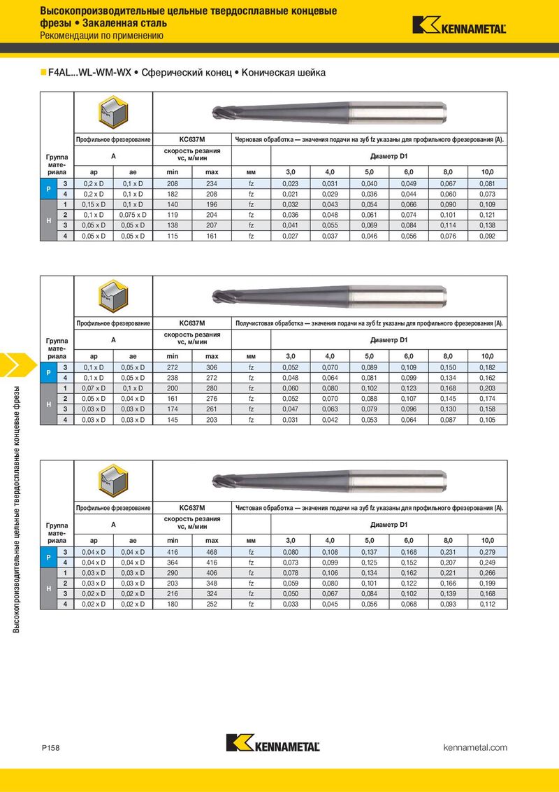 Высокопроизводительные цельные твердосплавные концевые фрезы • Закаленная сталь Рекомендации по применению F4AL...WL-WM-WX • Сферический конец • Коническая шейка Профильное фрезерование KC637M Черновая обработка — значения подачи на зуб fz указаны для профильного фрезерования (A). A скорость резания Диаметр D1 Группа vc, м/мин мате- риала ap ae min max мм 3,0 4,0 5,0 6,0 8,0 10,0 P 3 0,2 x D 0,1 x D 208 234 fz 0,023 0,031 0,040 0,049 0,067 0,081 4 0,2 x D 0,1 x D 182 208 fz 0,021 0,029 0,036 0,044 0,060 0,073 1 0,15 x D 0,1 x D 140 196 fz 0,032 0,043 0,054 0,066 0,090 0,109 H 2 0,1 x D 0,075 x D 119 204 fz 0,036 0,048 0,061 0,074 0,101 0,121 3 0,05 x D 0,05 x D 138 207 fz 0,041 0,055 0,069 0,084 0,114 0,138 4 0,05 x D 0,05 x D 115 161 fz 0,027 0,037 0,046 0,056 0,076 0,092 Профильное фрезерование KC637M Получистовая обработка — значения подачи на зуб fz указаны для профильного фрезерования (A). A скорость резания Диаметр D1 Группа vc, м/мин мате- риала ap ae min max мм 3,0 4,0 5,0 6,0 8,0 10,0 P 3 0,1 x D 0,05 x D 272 306 fz 0,052 0,070 0,089 0,109 0,150 0,182 4 0,1 x D 0,05 x D 238 272 fz 0,048 0,064 0,081 0,099 0,134 0,162 Высокопроизводительные цельные твердосплавные концевые фрезы 1 0,07 x D 0,1 x D 200 280 fz 0,060 0,080 0,102 0,123 0,168 0,203 H 2 0,05 x D 0,04 x D 161 276 fz 0,052 0,070 0,088 0,107 0,145 0,174 3 0,03 x D 0,03 x D 174 261 fz 0,047 0,063 0,079 0,096 0,130 0,158 4 0,03 x D 0,03 x D 145 203 fz 0,031 0,042 0,053 0,064 0,087 0,105 Профильное фрезерование KC637M Чистовая обработка — значения подачи на зуб fz указаны для профильного фрезерования (A). A скорость резания Диаметр D1 Группа vc, м/мин мате- риала ap ae min max мм 3,0 4,0 5,0 6,0 8,0 10,0 P 3 0,04 x D 0,04 x D 416 468 fz 0,080 0,108 0,137 0,168 0,231 0,279 4 0,04 x D 0,04 x D 364 416 fz 0,073 0,099 0,125 0,152 0,207 0,249 1 0,03 x D 0,03 x D 290 406 fz 0,078 0,106 0,134 0,162 0,221 0,266 H 2 0,03 x D 0,03 x D 203 348 fz 0,059 0,080 0,101 0,122 0,166 0,199 3 0,02 x D 0,02 x D 216 324 fz 0,050 0,067 0,084 0,102 0,139 0,168 4 0,02 x D 0,02 x D 180 252 fz 0,033 0,045 0,056 0,068 0,093 0,112 P158 kennametal.com