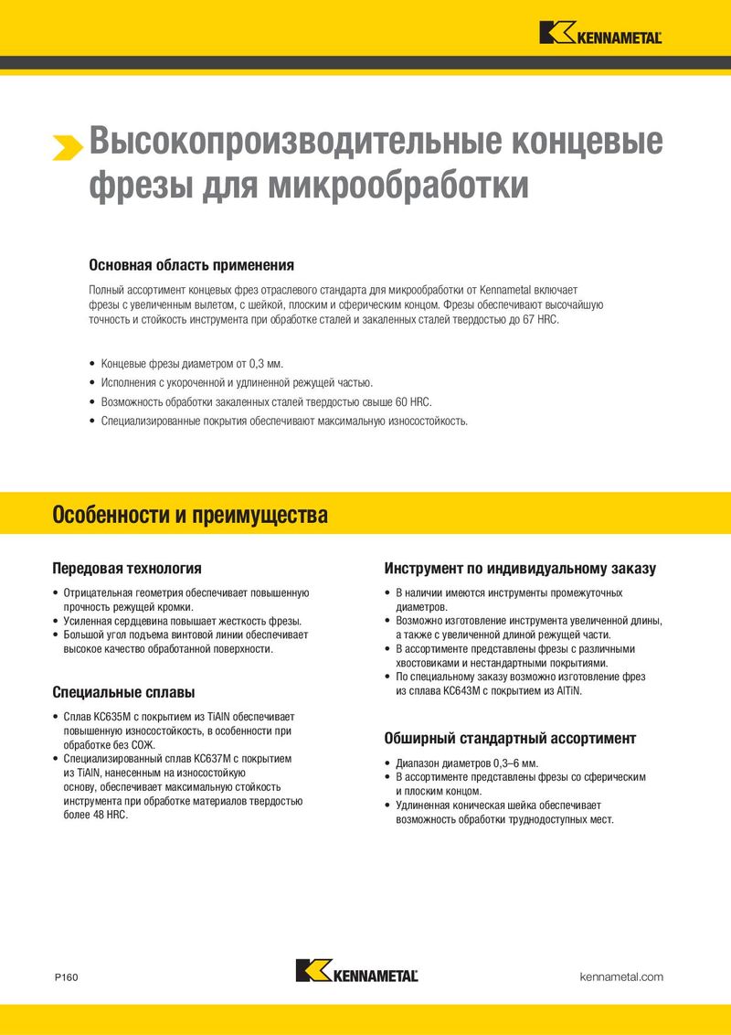 Высокопроизводительные концевые фрезы для микрообработки Основная область применения Полный ассортимент концевых фрез отраслевого стандарта для микрообработки от Kennametal включает фрезы с увеличенным вылетом, с шейкой, плоским и сферическим концом. Фрезы обеспечивают высочайшую точность и стойкость инструмента при обработке сталей и закаленных сталей твердостью до 67 HRC. • Концевые фрезы диаметром от 0,3 мм. • Исполнения с укороченной и удлиненной режущей частью. • Возможность обработки закаленных сталей твердостью свыше 60 HRC. • Специализированные покрытия обеспечивают максимальную износостойкость. Особенности и преимущества Передовая технология Инструмент по индивидуальному заказу • Отрицательная геометрия обеспечивает повышенную • В наличии имеются инструменты промежуточных прочность режущей кромки. диаметров. • Усиленная сердцевина повышает жесткость фрезы. • Возможно изготовление инструмента увеличенной длины, • Большой угол подъема винтовой линии обеспечивает а также с увеличенной длиной режущей части. высокое качество обработанной поверхности. • В ассортименте представлены фрезы с различными хвостовиками и нестандартными покрытиями. • По специальному заказу возможно изготовление фрез Специальные сплавы из сплава KC643M с покрытием из AlTiN. • Сплав KC635M с покрытием из TiAlN обеспечивает повышенную износостойкость, в особенности при Обширный стандартный ассортимент обработке без СОЖ. • Специализированный сплав KC637M с покрытием • Диапазон диаметров 0,3–6 мм. из TiAlN, нанесенным на износостойкую • В ассортименте представлены фрезы со сферическим основу, обеспечивает максимальную стойкость и плоским концом. инструмента при обработке материалов твердостью • Удлиненная коническая шейка обеспечивает более 48 HRC. возможность обработки труднодоступных мест. P160 kennametal.com