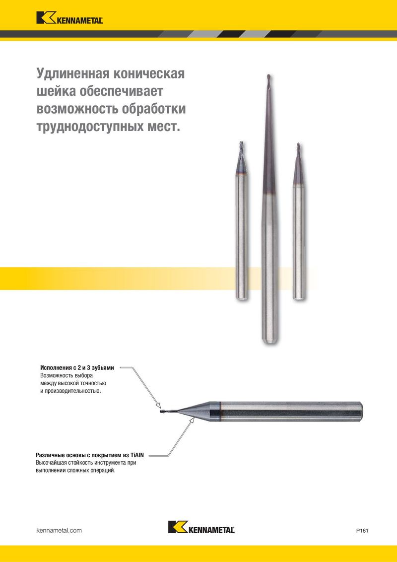 Удлиненная коническая шейка обеспечивает возможность обработки труднодоступных мест. Исполнения с 2 и 3 зубьями Возможность выбора между высокой точностью и производительностью. Различные основы с покрытием из TiAlN Высочайшая стойкость инструмента при выполнении сложных операций. kennametal.com P161