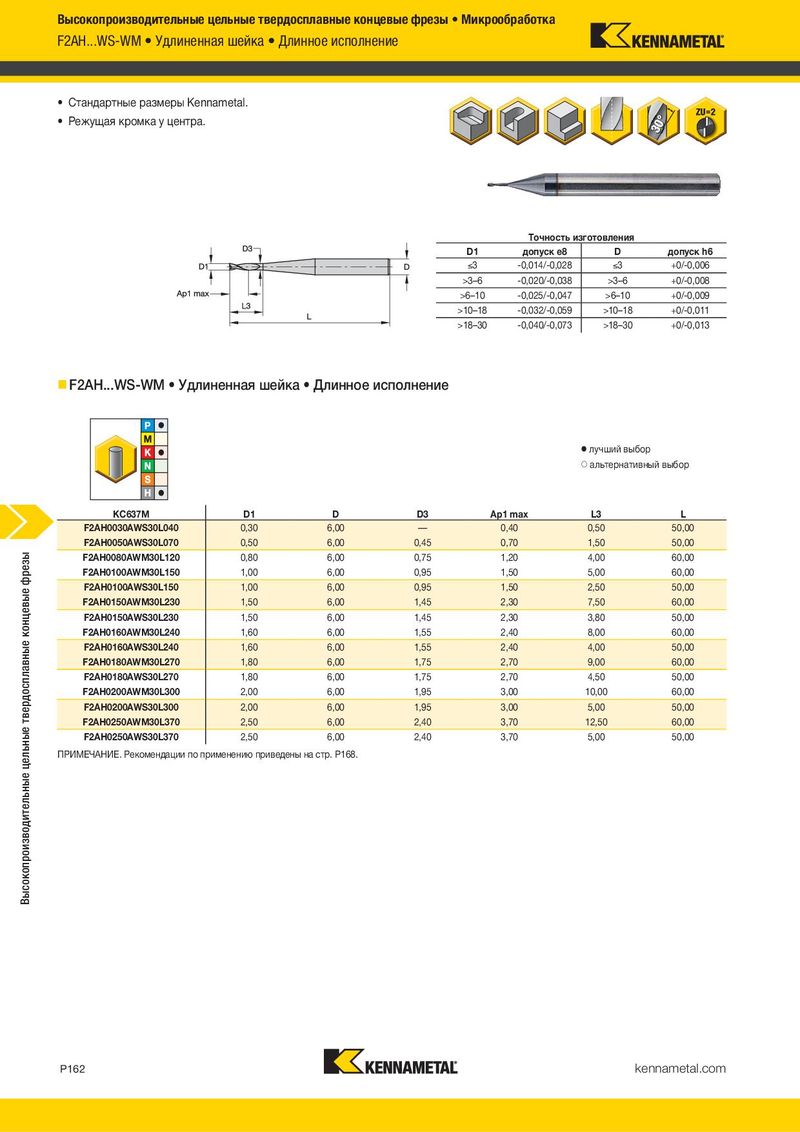 Высокопроизводительные цельные твердосплавные концевые фрезы • Микрообработка F2AH...WS-WM • Удлиненная шейка • Длинное исполнение • Стандартные размеры Kennametal. • Режущая кромка у центра. Tочность изготовления D1 допуск e8 D допуск h6 )3 -0,014/-0,028 )3 +0/-0,006 >3–6 -0,020/-0,038 >3–6 +0/-0,008 >6–10 -0,025/-0,047 >6–10 +0/-0,009 >10–18 -0,032/-0,059 >10–18 +0/-0,011 >18–30 -0,040/-0,073 >18–30 +0/-0,013 F2AH...WS-WM • Удлиненная шейка • Длинное исполнение ⅷ лучший выбор ࠗ альтернативный выбор KC637M D1 D D3 Ap1 max L3 L F2AH0030AWS30L040 0,30 6,00 — 0,40 0,50 50,00 F2AH0050AWS30L070 0,50 6,00 0,45 0,70 1,50 50,00 Высокопроизводительные цельные твердосплавные концевые фрезы F2AH0080AWM30L120 0,80 6,00 0,75 1,20 4,00 60,00 F2AH0100AWM30L150 1,00 6,00 0,95 1,50 5,00 60,00 F2AH0100AWS30L150 1,00 6,00 0,95 1,50 2,50 50,00 F2AH0150AWM30L230 1,50 6,00 1,45 2,30 7,50 60,00 F2AH0150AWS30L230 1,50 6,00 1,45 2,30 3,80 50,00 F2AH0160AWM30L240 1,60 6,00 1,55 2,40 8,00 60,00 F2AH0160AWS30L240 1,60 6,00 1,55 2,40 4,00 50,00 F2AH0180AWM30L270 1,80 6,00 1,75 2,70 9,00 60,00 F2AH0180AWS30L270 1,80 6,00 1,75 2,70 4,50 50,00 F2AH0200AWM30L300 2,00 6,00 1,95 3,00 10,00 60,00 F2AH0200AWS30L300 2,00 6,00 1,95 3,00 5,00 50,00 F2AH0250AWM30L370 2,50 6,00 2,40 3,70 12,50 60,00 F2AH0250AWS30L370 2,50 6,00 2,40 3,70 5,00 50,00 ПРИМЕЧАНИЕ. Рекомендации по применению приведены на стр. P168. P162 kennametal.com
