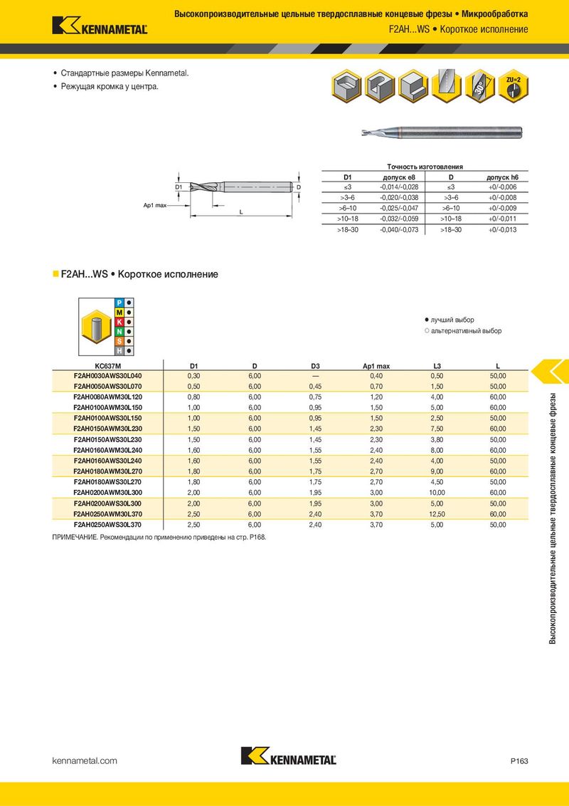 Высокопроизводительные цельные твердосплавные концевые фрезы • Микрообработка F2AH...WS • Короткое исполнение • Стандартные размеры Kennametal. • Режущая кромка у центра. Tочность изготовления D1 допуск e8 D допуск h6 )3 -0,014/-0,028 )3 +0/-0,006 >3–6 -0,020/-0,038 >3–6 +0/-0,008 >6–10 -0,025/-0,047 >6–10 +0/-0,009 >10–18 -0,032/-0,059 >10–18 +0/-0,011 >18–30 -0,040/-0,073 >18–30 +0/-0,013 F2AH...WS • Короткое исполнение ⅷ лучший выбор ࠗ альтернативный выбор KC63275M D1 D D3 Ap1 max L3 L F2AH0030AWS30L040 0,30 6,00 — 0,40 0,50 50,00 F2AH0050AWS30L070 0,50 6,00 0,45 0,70 1,50 50,00 F2AH0080AWM30L120 0,80 6,00 0,75 1,20 4,00 60,00 Высокопроизводительные цельные твердосплавные концевые фрезы F2AH0100AWM30L150 1,00 6,00 0,95 1,50 5,00 60,00 F2AH0100AWS30L150 1,00 6,00 0,95 1,50 2,50 50,00 F2AH0150AWM30L230 1,50 6,00 1,45 2,30 7,50 60,00 F2AH0150AWS30L230 1,50 6,00 1,45 2,30 3,80 50,00 F2AH0160AWM30L240 1,60 6,00 1,55 2,40 8,00 60,00 F2AH0160AWS30L240 1,60 6,00 1,55 2,40 4,00 50,00 F2AH0180AWM30L270 1,80 6,00 1,75 2,70 9,00 60,00 F2AH0180AWS30L270 1,80 6,00 1,75 2,70 4,50 50,00 F2AH0200AWM30L300 2,00 6,00 1,95 3,00 10,00 60,00 F2AH0200AWS30L300 2,00 6,00 1,95 3,00 5,00 50,00 F2AH0250AWM30L370 2,50 6,00 2,40 3,70 12,50 60,00 F2AH0250AWS30L370 2,50 6,00 2,40 3,70 5,00 50,00 ПРИМЕЧАНИЕ. Рекомендации по применению приведены на стр. P168. kennametal.com P163