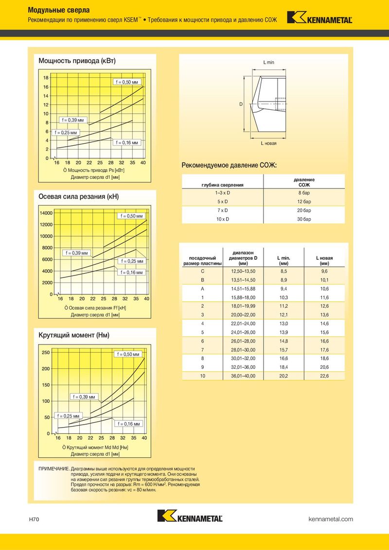 Модульные сверла Рекомендации по применению сверл KSEM™ • Требования к мощности привода и давлению СОЖ Мощность привода (кВт) L min f = 0,50 мм D f = 0,39 мм f = 0,25 мм f = 0,16 мм L новая Ò Мощность привода Ps [кВт] Рекомендуемое давление СОЖ: Диаметр сверла d1 [мм] давление глубина сверления СОЖ Осевая сила резания (кН) 1–3 x D 8 бар 5xD 12 бар 7xD 20 бар f = 0,50 мм 10 x D 30 бар f = 0,39 мм диапазон f = 0,25 мм посадочный диаметров D L min. L новая размер пластины (мм) (мм) (мм) f = 0,16 мм C 12,50–13,50 8,5 9,6 B 13,51–14,50 8,9 10,1 A 14,51–15,88 9,4 10,6 1 15,88–18,00 10,3 11,6 Ò Осевая сила резания Ff [кН] 2 18,01–19,99 11,2 12,6 Диаметр сверла d1 [мм] 3 20,00–22,00 12,1 13,6 4 22,01–24,00 13,0 14,6 Крутящий момент (Нм) 5 24,01–26,00 13,9 15,6 6 26,01–28,00 14,8 16,6 7 28,01–30,00 15,7 17,6 f = 0,50 мм 8 30,01–32,00 16,6 18,6 9 32,01–36,00 18,4 20,6 10 36,01–40,00 20,2 22,6 f = 0,39 мм f = 0,25 мм f = 0,16 мм Ò Крутящий момент Md Md [Нм] Диаметр сверла d1 [мм] ПРИМЕЧАНИЕ. Диаграммы выше используются для определения мощности привода, усилия подачи и крутящего момента. Они основаны на измерении сил резания группы термообработанных сталей. Предел прочности на разрыв: Rm = 600 Н/мм2. Рекомендуемая базовая скорость резания: vc = 80 м/мин. H70 kennametal.com
