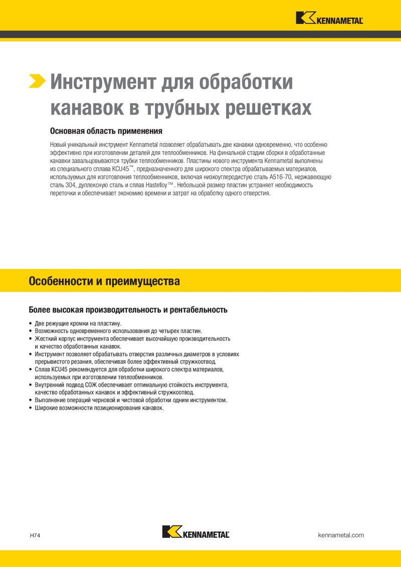 Инструмент для обработки канавок в трубных решетках Основная область применения Новый уникальный инструмент Kennametal позволяет обрабатывать две канавки одновременно, что особенно эффективно при изготовлении деталей для теплообменников. На финальной стадии сборки в обработанные канавки завальцовываются трубки теплообменников. Пластины нового инструмента Kennametal выполнены из специального сплава KCU45™, предназначенного для широкого спектра обрабатываемых материалов, используемых для изготовления теплообменников, включая низкоуглеродистую сталь A516-70, нержавеющую сталь 304, дуплексную сталь и сплав Hastelloy™. Небольшой размер пластин устраняет необходимость переточки и обеспечивает экономию времени и затрат на обработку одного отверстия. Особенности и преимущества Более высокая производительность и рентабельность • Две режущие кромки на пластину. • Возможность одновременного использования до четырех пластин. • Жесткий корпус инструмента обеспечивает высочайшую производительность и качество обработанных канавок. • Инструмент позволяет обрабатывать отверстия различных диаметров в условиях прерывистого резания, обеспечивая более эффективный стружкоотвод. • Сплав KCU45 рекомендуется для обработки широкого спектра материалов, используемых при изготовлении теплообменников. • Внутренний подвод СОЖ обеспечивает оптимальную стойкость инструмента, качество обработанных канавок и эффективный стружкоотвод. • Выполнение операций черновой и чистовой обработки одним инструментом. • Широкие возможности позиционирования канавок. H74 kennametal.com