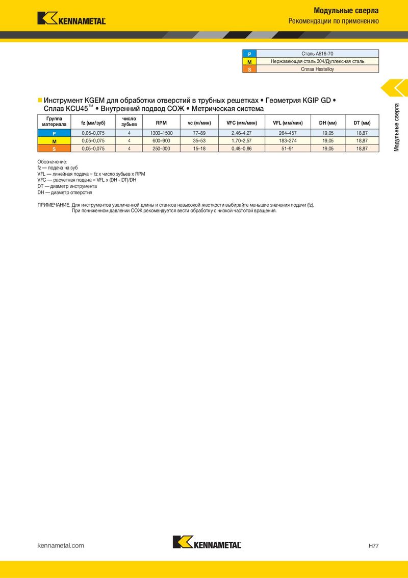 Модульные сверла Рекомендации по применению P Сталь A516-70 M Нержавеющая сталь 304/Дуплексная сталь S Сплав Hastelloy Инструмент KGEM для обработки отверстий в трубных решетках • Геометрия KGIP GD • Модульные сверла Сплав KCU45™ • Внутренний подвод СОЖ • Метрическая система Группа fz (мм/зуб) число RPM vc (м/мин) VFC (мм/мин) VFL (мм/мин) DH (мм) DT (мм) материала зубьев P 0,05–0,075 4 1300–1500 77–89 2,46–4,27 264–457 19,05 18,87 M 0,05–0,075 4 600–900 35–53 1,70–2,57 183–274 19,05 18,87 S 0,05–0,075 4 250–300 15–18 0,48–0,86 51–91 19,05 18,87 Обозначение: fz — подача на зуб VFL — линейная подача = fz x число зубьев x RPM VFC — расчетная подача = VFL x (DH - DT)/DH DT — диаметр инструмента DH — диаметр отверстия ПРИМЕЧАНИЕ. Для инструментов увеличенной длины и станков невысокой жесткости выбирайте меньшие значения подачи (fz). При пониженном давлении СОЖ рекомендуется вести обработку с низкой частотой вращения. kennametal.com H77