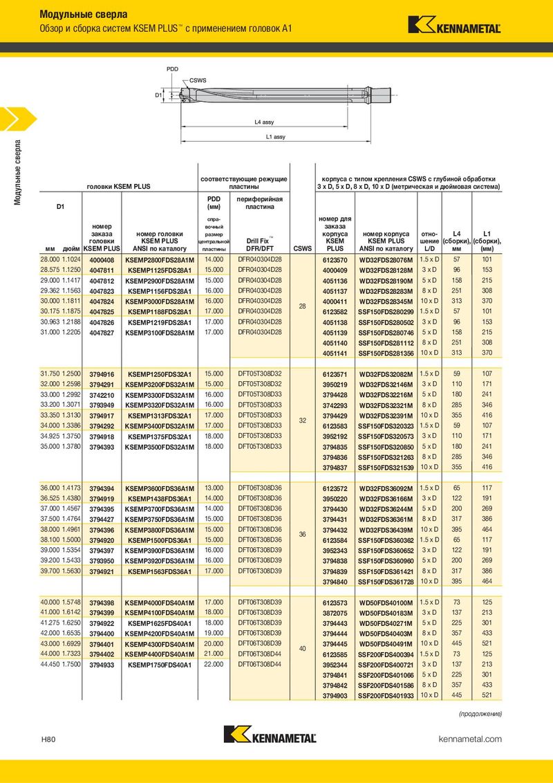 Модульные сверла Обзор и сборка систем KSEM PLUS™ с применением головок A1 Модульные сверла соответствующие режущие корпуса с типом крепления CSWS с глубиной обработки головки KSEM PLUS пластины 3 x D, 5 x D, 8 x D, 10 x D (метрическая и дюймовая система) PDD периферийная D1 (мм) пластина спра- номер для номер вочный заказа заказа номер головки размер Drill Fix™ корпуса номер корпуса отно- L4 L1 головки KSEM PLUS центральной KSEM KSEM PLUS шение (сборки), (сборки), мм дюйм KSEM PLUS ANSI по каталогу пластины DFR/DFT CSWS PLUS ANSI по каталогу L/D мм (мм) 28.000 1.1024 4000408 KSEMP2800FDS28A1M 14.000 DFR040304D28 6123570 WD32FDS28076M 1.5 x D 57 101 28.575 1.1250 4047811 KSEMP1125FDS28A1 15.000 DFR040304D28 4000409 WD32FDS28128M 3xD 96 153 29.000 1.1417 4047812 KSEMP2900FDS28A1M 15.000 DFR040304D28 4051136 WD32FDS28190M 5xD 158 215 29.362 1.1563 4047823 KSEMP1156FDS28A1 16.000 DFR040304D28 4051137 WD32FDS28283M 8xD 251 308 30.000 1.1811 4047824 KSEMP3000FDS28A1M 16.000 DFR040304D28 28 4000411 WD32FDS28345M 10 x D 313 370 30.175 1.1875 4047825 KSEMP1188FDS28A1 17.000 DFR040304D28 6123582 SSF150FDS280299 1.5 x D 57 101 30.963 1.2188 4047826 KSEMP1219FDS28A1 17.000 DFR040304D28 4051138 SSF150FDS280502 3xD 96 153 31.000 1.2205 4047827 KSEMP3100FDS28A1M 17.000 DFR040304D28 4051139 SSF150FDS280746 5xD 158 215 4051140 SSF150FDS281112 8xD 251 308 4051141 SSF150FDS281356 10 x D 313 370 31.750 1.2500 3794916 KSEMP1250FDS32A1 15.000 DFT05T308D32 6123571 WD32FDS32082M 1.5 x D 59 107 32.000 1.2598 3794291 KSEMP3200FDS32A1M 15.000 DFT05T308D32 3950219 WD32FDS32146M 3xD 110 171 33.000 1.2992 3742210 KSEMP3300FDS32A1M 16.000 DFT05T308D33 3794428 WD32FDS32216M 5xD 180 241 33.200 1.3071 3793949 KSEMP3320FDS32A1M 16.000 DFT05T308D33 3742293 WD32FDS32321M 8xD 285 346 33.350 1.3130 3794917 KSEMP1313FDS32A1 17.000 DFT05T308D33 32 3794429 WD32FDS32391M 10 x D 355 416 34.000 1.3386 3794292 KSEMP3400FDS32A1M 17.000 DFT05T308D33 6123583 SSF150FDS320323 1.5 x D 59 107 34.925 1.3750 3794918 KSEMP1375FDS32A1 18.000 DFT05T308D33 3952192 SSF150FDS320573 3xD 110 171 35.000 1.3780 3794393 KSEMP3500FDS32A1M 18.000 DFT05T308D33 3794835 SSF150FDS320850 5xD 180 241 3794836 SSF150FDS321263 8xD 285 346 3794837 SSF150FDS321539 10 x D 355 416 36.000 1.4173 3794394 KSEMP3600FDS36A1M 13.000 DFT06T308D36 6123572 WD32FDS36092M 1.5 x D 65 117 36.525 1.4380 3794919 KSEMP1438FDS36A1 14.000 DFT06T308D36 3950220 WD32FDS36166M 3xD 122 191 37.000 1.4567 3794395 KSEMP3700FDS36A1M 14.000 DFT06T308D36 3794430 WD32FDS36244M 5xD 200 269 37.500 1.4764 3794427 KSEMP3750FDS36A1M 15.000 DFT06T308D36 3794431 WD32FDS36361M 8xD 317 386 38.000 1.4961 3794396 KSEMP3800FDS36A1M 15.000 DFT06T308D36 36 3794432 WD32FDS36439M 10 x D 395 464 38.100 1.5000 3794920 KSEMP1500FDS36A1 15.000 DFT06T308D36 6123584 SSF150FDS360362 1.5 x D 65 117 39.000 1.5354 3794397 KSEMP3900FDS36A1M 16.000 DFT06T308D39 3952343 SSF150FDS360652 3xD 122 191 39.200 1.5433 3793950 KSEMP3920FDS36A1M 16.000 DFT06T308D39 3794838 SSF150FDS360960 5xD 200 269 39.700 1.5630 3794921 KSEMP1563FDS36A1 17.000 DFT06T308D39 3794839 SSF150FDS361421 8xD 317 386 3794840 SSF150FDS361728 10 x D 395 464 40.000 1.5748 3794398 KSEMP4000FDS40A1M 17.000 DFT06T308D39 6123573 WD50FDS40100M 1.5 x D 73 125 41.000 1.6142 3794399 KSEMP4100FDS40A1M 18.000 DFT06T308D39 3872075 WD50FDS40183M 3xD 137 213 41.275 1.6250 3794922 KSEMP1625FDS40A1 18.000 DFT06T308D39 3794443 WD50FDS40271M 5xD 225 301 42.000 1.6535 3794400 KSEMP4200FDS40A1M 19.000 DFT06T308D39 3794444 WD50FDS40403M 8xD 357 433 43.000 1.6929 3794401 KSEMP4300FDS40A1M 20.000 DFT06T308D39 40 3794445 WD50FDS40491M 10 x D 445 521 44.000 1.7323 3794402 KSEMP4400FDS40A1M 21.000 DFT06T308D44 6123585 SSF200FDS400394 1.5 x D 73 125 44.450 1.7500 3794933 KSEMP1750FDS40A1 22.000 DFT06T308D44 3952344 SSF200FDS400721 3xD 137 213 3794841 SSF200FDS401066 5xD 225 301 3794842 SSF200FDS401586 8xD 357 433 3794903 SSF200FDS401933 10 x D 445 521 (продолжение) H80 kennametal.com