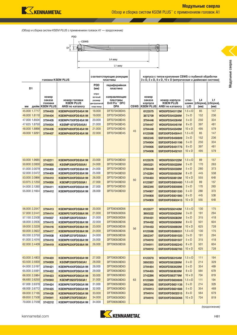 Модульные сверла Обзор и сборка систем KSEM PLUS™ с применением головок A1 (Обзор и сборка систем KSEM PLUS с применением головок A1 — продолжение) соответствующие режущие корпуса с типом крепления CSWS с глубиной обработки Модульные сверла головки KSEM PLUS пластины 3 x D, 5 x D, 8 x D, 10 x D (метрическая и дюймовая система) PDD периферийная D1 (мм) пластина спра- номер вочный направляющие номер заказа номер головки размер пластины заказа номер корпуса отно- L4 L1 головки KSEM PLUS центральной Drill Fix™ DFC корпуса KSEM PLUS шение (сборки), (сборки), мм дюйм KSEM PLUS ANSI по каталогу пластины DPA CSWS KSEM PLUS ANSI по каталогу L/D (мм) (мм) 45.000 1.7717 3794403 KSEMP4500FDS45A1M 18.000 DFT070408D45 6123575 WD50FDS45112M 1.5 x D 85 147 46.000 1.8110 3794404 KSEMP4600FDS45A1M 19.000 DFT070408D45 3872709 WD50FDS45206M 3xD 152 236 47.000 1.8504 3794405 KSEMP4700FDS45A1M 20.000 DFT070408D45 3794446 WD50FDS45304M 5xD 250 334 47.625 1.8750 3794934 KSEMP1875FDS45A1 21.000 DFT070408D45 3794447 WD50FDS45451M 8xD 397 481 48.000 1.8898 3794406 KSEMP4800FDS45A1M 21.000 DFT070408D45 45 3794448 WD50FDS45549M 10 x D 495 579 49.000 1.9291 3794407 KSEMP4900FDS45A1M 22.000 DFT070408D45 6123586 SSF200FDS450441 1.5 x D 85 147 3952345 SSF200FDS450809 3xD 152 236 3794904 SSF200FDS451196 5xD 250 334 3794905 SSF200FDS451775 8xD 397 481 3794906 SSF200FDS452161 10 x D 495 579 50.000 1.9685 3742211 KSEMP5000FDS50A1M 23.000 DFT070408D50 6123576 WD50FDS50122M 1.5 x D 89 157 50.800 2.0000 3794935 KSEMP2000FDS50A1 24.000 DFT070408D50 3950221 WD50FDS50228M 3xD 170 263 51.000 2.0079 3794408 KSEMP5100FDS50A1M 24.000 DFT070408D50 3794449 WD50FDS50338M 5xD 280 373 52.000 2.0472 3794409 KSEMP5200FDS50A1M 25.000 DFT070408D50 3742294 WD50FDS50503M 8xD 445 538 53.000 2.0866 3794410 KSEMP5300FDS50A1M 26.000 DFT070408D50 50 3794450 WD50FDS50613M 10 x D 555 648 53.975 2.1250 3794936 KSEMP2125FDS50A1 27.000 DFT070408D50 6123587 SSF200FDS500480 1.5 x D 89 157 54.000 2.1260 3794411 KSEMP5400FDS50A1M 27.000 DFT070408D50 3952346 SSF200FDS500896 3xD 170 263 55.000 2.1654 3794412 KSEMP5500FDS50A1M 28.000 DFT070408D50 3794907 SSF200FDS501330 5xD 280 373 3794908 SSF200FDS501980 8xD 445 538 3794909 SSF200FDS502413 10 x D 555 648 56.000 2.2047 3794413 KSEMP5600FDS56A1M 20.000 DFT090508D56 6123577 WD50FDS56140M 1.5 x D 130 175 57.000 2.2441 3794414 KSEMP5700FDS56A1M 21.000 DFT090508D56 3950222 WD50FDS56259M 3xD 191 294 57.150 2.2500 3794937 KSEMP2250FDS56A1 21.000 DFT090508D56 3794451 WD50FDS56383M 5xD 315 418 58.000 2.2835 3794415 KSEMP5800FDS56A1M 22.000 DFT090508D56 3794452 WD50FDS56569M 8xD 501 604 59.000 2.3228 3794416 KSEMP5900FDS56A1M 23.000 DFT090508D56 56 3794453 WD50FDS56693M 10 x D 625 728 60.000 2.3622 3794417 KSEMP6000FDS56A1M 24.000 DFT090508D56 6123588 SSF200FDS560551 1.5 x D 130 175 60.330 2.3750 3794938 KSEMP2375FDS56A1 24.000 DFT090508D56 3952347 SSF200FDS561020 3xD 191 294 61.000 2.4016 3794418 KSEMP6100FDS56A1M 25.000 DFT090508D56 3794910 SSF200FDS561507 5xD 315 418 62.000 2.4409 3794419 KSEMP6200FDS56A1M 26.000 DFT090508D56 3794911 SSF200FDS562240 8xD 501 604 3794912 SSF200FDS562783 10 x D 625 728 63.000 2.4803 3794420 KSEMP6300FDS63A1M 27.000 DFT090508D63 6123578 WD50FDS63154M 1.5 x D 111 194 63.500 2.5000 3794939 KSEMP2500FDS63A1 28.000 DFT090508D63 3950333 WD50FDS63289M 3xD 214 329 64.000 2.5197 3794421 KSEMP6400FDS63A1M 28.000 DFT090508D63 3794454 WD50FDS63429M 5xD 354 469 65.000 2.5591 3794422 KSEMP6500FDS63A1M 29.000 DFT090508D63 3794455 WD50FDS63639M 8xD 564 679 66.000 2.5984 3794423 KSEMP6600FDS63A1M 30.000 DFT090508D63 3742296 WD50FDS63779M 10 x D 704 819 66.680 2.6250 3794940 KSEMP2625FDS63A1 31.000 DFT090508D63 63 6123589 SSF200FDS630606 1.5 x D 111 194 67.000 2.6378 3794424 KSEMP6700FDS63A1M 31.000 DFT090508D63 3952348 SSF200FDS631138 3xD 214 329 68.000 2.6772 3794425 KSEMP6800FDS63A1M 32.000 DFT090508D63 3794913 SSF200FDS631688 5xD 354 469 69.000 2.7165 3794426 KSEMP6900FDS63A1M 33.000 DFT090508D63 3794914 SSF200FDS632515 8xD 564 679 69.850 2.7500 3794941 KSEMP2750FDS63A1 34.000 DFT090508D63 3794915 SSF200FDS633066 10 x D 704 819 70.000 2.7559 3742212 KSEMP7000FDS63A1M 34.000 DFT090508D63 (продолжение) kennametal.com H81