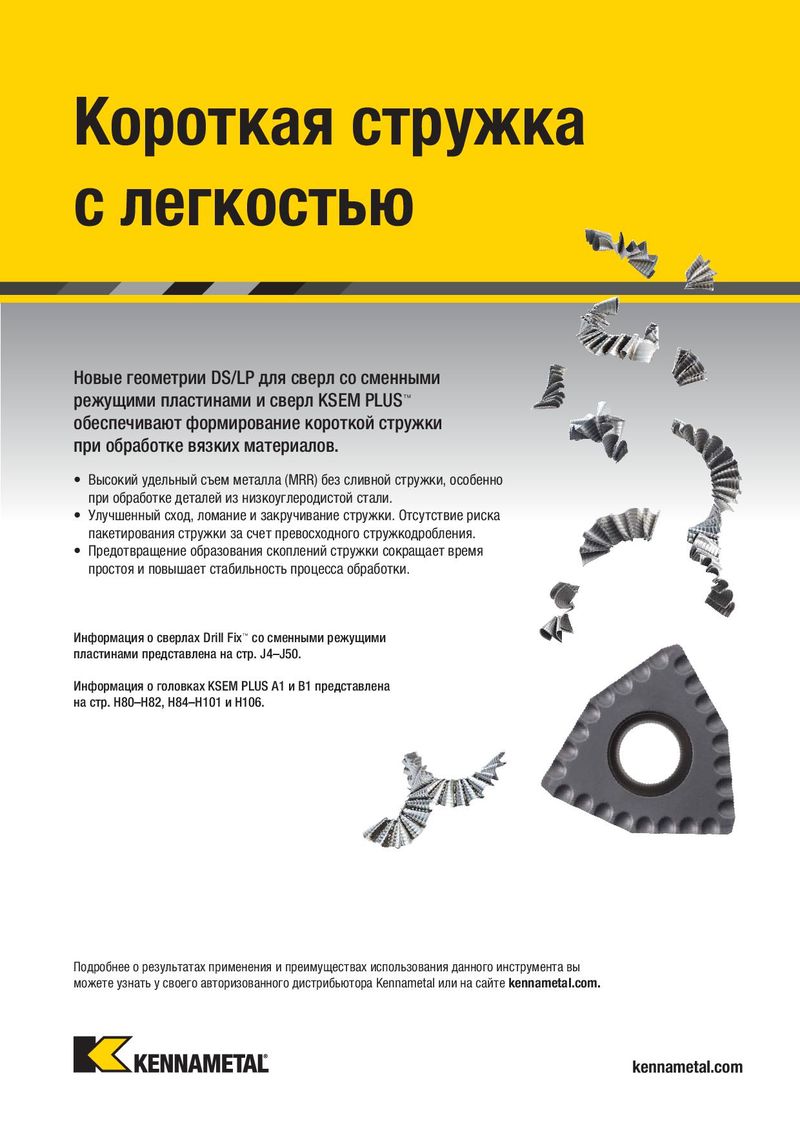 Короткая стружка с легкостью Новые геометрии DS/LP для сверл со сменными режущими пластинами и сверл KSEM PLUS™ обеспечивают формирование короткой стружки при обработке вязких материалов. • Высокий удельный съем металла (MRR) без сливной стружки, особенно при обработке деталей из низкоуглеродистой стали. • Улучшенный сход, ломание и закручивание стружки. Отсутствие риска пакетирования стружки за счет превосходного стружкодробления. • Предотвращение образования скоплений стружки сокращает время простоя и повышает стабильность процесса обработки. Информация о сверлах Drill Fix™ со сменными режущими пластинами представлена на стр. J4–J50. Информация о головках KSEM PLUS A1 и B1 представлена на стр. H80–H82, H84–H101 и H106. Подробнее о результатах применения и преимуществах использования данного инструмента вы можете узнать у своего авторизованного дистрибьютора Kennametal или на сайте kennametal.com. kennametal.com