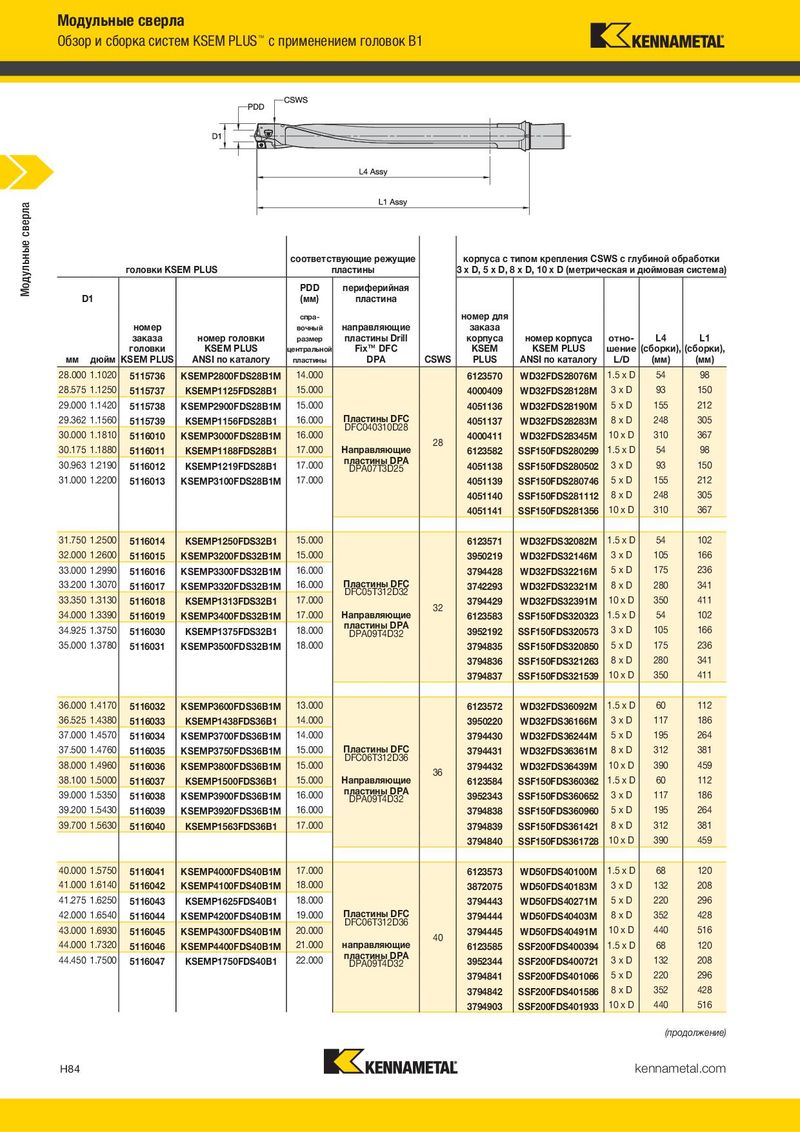 Модульные сверла Обзор и сборка систем KSEM PLUS™ с применением головок B1 Модульные сверла соответствующие режущие корпуса с типом крепления CSWS с глубиной обработки головки KSEM PLUS пластины 3 x D, 5 x D, 8 x D, 10 x D (метрическая и дюймовая система) PDD периферийная D1 (мм) пластина спра- номер для номер вочный направляющие заказа заказа номер головки размер пластины Drill корпуса номер корпуса отно- L4 L1 головки KSEM PLUS центральной Fix™ DFC KSEM KSEM PLUS шение (сборки), (сборки), мм дюйм KSEM PLUS ANSI по каталогу пластины DPA CSWS PLUS ANSI по каталогу L/D (мм) (мм) 28.000 1.1020 5115736 KSEMP2800FDS28B1M 14.000 6123570 WD32FDS28076M 1.5 x D 54 98 28.575 1.1250 5115737 KSEMP1125FDS28B1 15.000 4000409 WD32FDS28128M 3xD 93 150 29.000 1.1420 5115738 KSEMP2900FDS28B1M 15.000 4051136 WD32FDS28190M 5xD 155 212 29.362 1.1560 5115739 KSEMP1156FDS28B1 16.000 Пластины DFC 4051137 WD32FDS28283M 8xD 248 305 DFC040310D28 30.000 1.1810 16.000 10 x D 310 367 5116010 KSEMP3000FDS28B1M 28 4000411 WD32FDS28345M 30.175 1.1880 5116011 KSEMP1188FDS28B1 17.000 Направляющие 6123582 SSF150FDS280299 1.5 x D 54 98 30.963 1.2190 5116012 KSEMP1219FDS28B1 17.000 пластины DPA 4051138 SSF150FDS280502 3xD 93 150 DPA07T3D25 31.000 1.2200 5116013 KSEMP3100FDS28B1M 17.000 4051139 SSF150FDS280746 5xD 155 212 4051140 SSF150FDS281112 8xD 248 305 4051141 SSF150FDS281356 10 x D 310 367 31.750 1.2500 5116014 KSEMP1250FDS32B1 15.000 6123571 WD32FDS32082M 1.5 x D 54 102 32.000 1.2600 5116015 KSEMP3200FDS32B1M 15.000 3950219 WD32FDS32146M 3xD 105 166 33.000 1.2990 5116016 KSEMP3300FDS32B1M 16.000 3794428 WD32FDS32216M 5xD 175 236 33.200 1.3070 5116017 KSEMP3320FDS32B1M 16.000 Пластины DFC 3742293 WD32FDS32321M 8xD 280 341 DFC05T312D32 33.350 1.3130 17.000 10 x D 350 411 5116018 KSEMP1313FDS32B1 32 3794429 WD32FDS32391M 34.000 1.3390 5116019 KSEMP3400FDS32B1M 17.000 Направляющие 6123583 SSF150FDS320323 1.5 x D 54 102 34.925 1.3750 5116030 KSEMP1375FDS32B1 18.000 пластины DPA 3952192 SSF150FDS320573 3xD 105 166 DPA09T4D32 35.000 1.3780 5116031 KSEMP3500FDS32B1M 18.000 3794835 SSF150FDS320850 5xD 175 236 3794836 SSF150FDS321263 8xD 280 341 3794837 SSF150FDS321539 10 x D 350 411 36.000 1.4170 5116032 KSEMP3600FDS36B1M 13.000 6123572 WD32FDS36092M 1.5 x D 60 112 36.525 1.4380 5116033 KSEMP1438FDS36B1 14.000 3950220 WD32FDS36166M 3xD 117 186 37.000 1.4570 5116034 KSEMP3700FDS36B1M 14.000 3794430 WD32FDS36244M 5xD 195 264 37.500 1.4760 5116035 KSEMP3750FDS36B1M 15.000 Пластины DFC 3794431 WD32FDS36361M 8xD 312 381 DFC06T312D36 38.000 1.4960 15.000 3794432 WD32FDS36439M 10 x D 390 459 5116036 KSEMP3800FDS36B1M 36 38.100 1.5000 5116037 KSEMP1500FDS36B1 15.000 Направляющие 6123584 SSF150FDS360362 1.5 x D 60 112 39.000 1.5350 5116038 KSEMP3900FDS36B1M 16.000 пластины DPA 3952343 SSF150FDS360652 3xD 117 186 DPA09T4D32 39.200 1.5430 5116039 KSEMP3920FDS36B1M 16.000 3794838 SSF150FDS360960 5xD 195 264 39.700 1.5630 5116040 KSEMP1563FDS36B1 17.000 3794839 SSF150FDS361421 8xD 312 381 3794840 SSF150FDS361728 10 x D 390 459 40.000 1.5750 5116041 KSEMP4000FDS40B1M 17.000 6123573 WD50FDS40100M 1.5 x D 68 120 41.000 1.6140 5116042 KSEMP4100FDS40B1M 18.000 3872075 WD50FDS40183M 3xD 132 208 41.275 1.6250 5116043 KSEMP1625FDS40B1 18.000 3794443 WD50FDS40271M 5xD 220 296 42.000 1.6540 5116044 KSEMP4200FDS40B1M 19.000 Пластины DFC 3794444 WD50FDS40403M 8xD 352 428 DFC06T312D36 43.000 1.6930 20.000 10 x D 440 516 5116045 KSEMP4300FDS40B1M 40 3794445 WD50FDS40491M 44.000 1.7320 5116046 KSEMP4400FDS40B1M 21.000 направляющие 6123585 SSF200FDS400394 1.5 x D 68 120 44.450 1.7500 5116047 KSEMP1750FDS40B1 22.000 пластины DPA 3952344 SSF200FDS400721 3xD 132 208 DPA09T4D32 3794841 SSF200FDS401066 5xD 220 296 3794842 SSF200FDS401586 8xD 352 428 3794903 SSF200FDS401933 10 x D 440 516 (продолжение) H84 kennametal.com