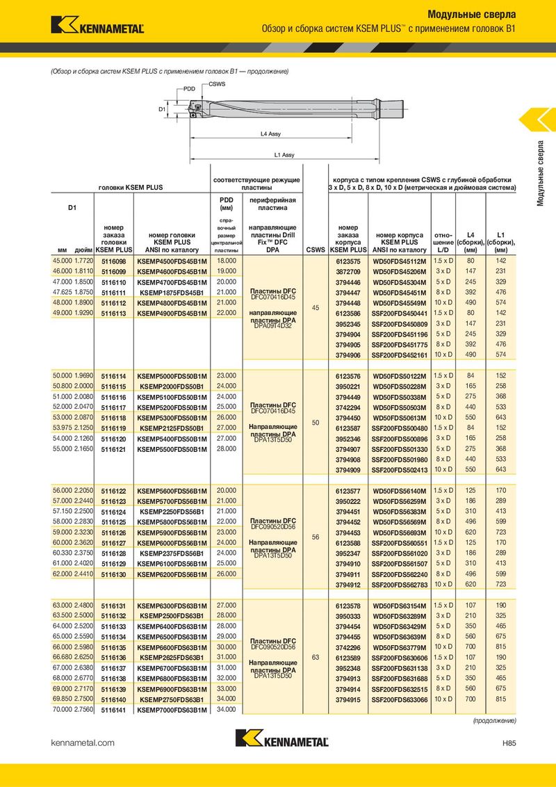 Модульные сверла Обзор и сборка систем KSEM PLUS™ с применением головок B1 (Обзор и сборка систем KSEM PLUS с применением головок B1 — продолжение) соответствующие режущие корпуса с типом крепления CSWS с глубиной обработки Модульные сверла головки KSEM PLUS пластины 3 x D, 5 x D, 8 x D, 10 x D (метрическая и дюймовая система) PDD периферийная D1 (мм) пластина спра- номер вочный направляющие номер заказа номер головки размер пластины Drill заказа номер корпуса отно- L4 L1 головки KSEM PLUS центральной Fix™ DFC корпуса KSEM PLUS шение (сборки), (сборки), мм дюйм KSEM PLUS ANSI по каталогу пластины DPA CSWS KSEM PLUS ANSI по каталогу L/D (мм) (мм) 45.000 1.7720 5116098 KSEMP4500FDS45B1M 18.000 6123575 WD50FDS45112M 1.5 x D 80 142 46.000 1.8110 5116099 KSEMP4600FDS45B1M 19.000 3872709 WD50FDS45206M 3xD 147 231 47.000 1.8500 5116110 KSEMP4700FDS45B1M 20.000 3794446 WD50FDS45304M 5xD 245 329 47.625 1.8750 5116111 KSEMP1875FDS45B1 21.000 Пластины DFC 3794447 WD50FDS45451M 8xD 392 476 DFC070416D45 48.000 1.8900 21.000 10 x D 490 574 5116112 KSEMP4800FDS45B1M 45 3794448 WD50FDS45549M 49.000 1.9290 5116113 KSEMP4900FDS45B1M 22.000 направляющие 6123586 SSF200FDS450441 1.5 x D 80 142 пластины DPA 3952345 SSF200FDS450809 3xD 147 231 DPA09T4D32 3794904 SSF200FDS451196 5xD 245 329 3794905 SSF200FDS451775 8xD 392 476 3794906 SSF200FDS452161 10 x D 490 574 50.000 1.9690 5116114 KSEMP5000FDS50B1M 23.000 6123576 WD50FDS50122M 1.5 x D 84 152 50.800 2.0000 5116115 KSEMP2000FDS50B1 24.000 3950221 WD50FDS50228M 3xD 165 258 51.000 2.0080 5116116 KSEMP5100FDS50B1M 24.000 3794449 WD50FDS50338M 5xD 275 368 52.000 2.0470 5116117 KSEMP5200FDS50B1M 25.000 Пластины DFC 3742294 WD50FDS50503M 8xD 440 533 DFC070416D45 10 x D 550 643 53.000 2.0870 5116118 KSEMP5300FDS50B1M 26.000 50 3794450 WD50FDS50613M 53.975 2.1250 5116119 KSEMP2125FDS50B1 27.000 Направляющие 6123587 SSF200FDS500480 1.5 x D 84 152 54.000 2.1260 5116120 KSEMP5400FDS50B1M 27.000 пластины DPA 3952346 SSF200FDS500896 3xD 165 258 DPA13T5D50 55.000 2.1650 5116121 KSEMP5500FDS50B1M 28.000 3794907 SSF200FDS501330 5xD 275 368 3794908 SSF200FDS501980 8xD 440 533 3794909 SSF200FDS502413 10 x D 550 643 56.000 2.2050 5116122 KSEMP5600FDS56B1M 20.000 6123577 WD50FDS56140M 1.5 x D 125 170 57.000 2.2440 5116123 KSEMP5700FDS56B1M 21.000 3950222 WD50FDS56259M 3xD 186 289 57.150 2.2500 5116124 KSEMP2250FDS56B1 21.000 3794451 WD50FDS56383M 5xD 310 413 58.000 2.2830 5116125 KSEMP5800FDS56B1M 22.000 Пластины DFC 3794452 WD50FDS56569M 8xD 496 599 DFC090520D56 59.000 2.3230 5116126 KSEMP5900FDS56B1M 23.000 3794453 WD50FDS56693M 10 x D 620 723 56 60.000 2.3620 5116127 KSEMP6000FDS56B1M 24.000 Направляющие 6123588 SSF200FDS560551 1.5 x D 125 170 60.330 2.3750 5116128 KSEMP2375FDS56B1 24.000 пластины DPA 3952347 SSF200FDS561020 3xD 186 289 DPA13T5D50 61.000 2.4020 5116129 KSEMP6100FDS56B1M 25.000 3794910 SSF200FDS561507 5xD 310 413 62.000 2.4410 5116130 KSEMP6200FDS56B1M 26.000 3794911 SSF200FDS562240 8xD 496 599 3794912 SSF200FDS562783 10 x D 620 723 63.000 2.4800 5116131 KSEMP6300FDS63B1M 27.000 6123578 WD50FDS63154M 1.5 x D 107 190 63.500 2.5000 5116132 KSEMP2500FDS63B1 28.000 3950333 WD50FDS63289M 3xD 210 325 64.000 2.5200 5116133 KSEMP6400FDS63B1M 28.000 3794454 WD50FDS63429M 5xD 350 465 65.000 2.5590 5116134 KSEMP6500FDS63B1M 29.000 Пластины DFC 3794455 WD50FDS63639M 8xD 560 675 66.000 2.5980 5116135 KSEMP6600FDS63B1M 30.000 DFC090520D56 3742296 WD50FDS63779M 10 x D 700 815 66.680 2.6250 5116136 KSEMP2625FDS63B1 31.000 Направляющие 63 6123589 SSF200FDS630606 1.5 x D 107 190 67.000 2.6380 5116137 KSEMP6700FDS63B1M 31.000 пластины DPA 3952348 SSF200FDS631138 3xD 210 325 68.000 2.6770 5116138 KSEMP6800FDS63B1M 32.000 DPA13T5D50 3794913 SSF200FDS631688 5xD 350 465 69.000 2.7170 5116139 KSEMP6900FDS63B1M 33.000 3794914 SSF200FDS632515 8xD 560 675 69.850 2.7500 5116140 KSEMP2750FDS63B1 34.000 3794915 SSF200FDS633066 10 x D 700 815 70.000 2.7560 5116141 KSEMP7000FDS63B1M 34.000 (продолжение) kennametal.com H85