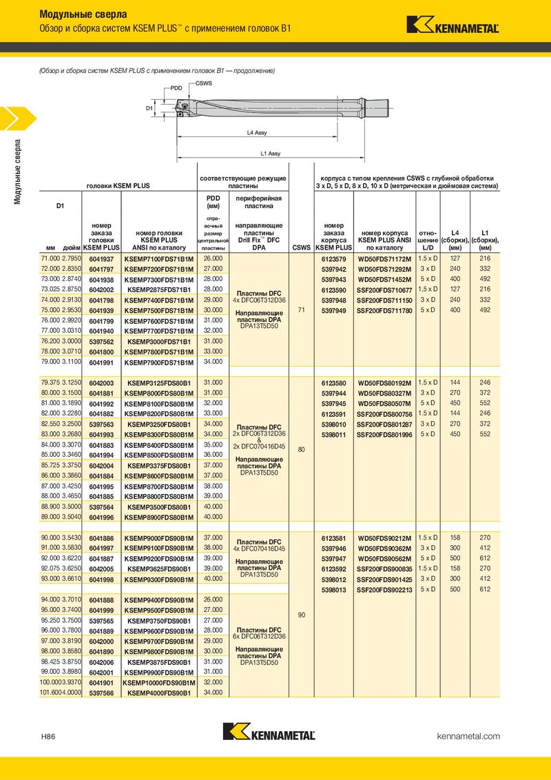 Модульные сверла Обзор и сборка систем KSEM PLUS™ с применением головок B1 (Обзор и сборка систем KSEM PLUS с применением головок B1 — продолжение) Модульные сверла соответствующие режущие корпуса с типом крепления CSWS с глубиной обработки головки KSEM PLUS пластины 3 x D, 5 x D, 8 x D, 10 x D (метрическая и дюймовая система) PDD периферийная D1 (мм) пластина спра- номер вочный направляющие номер заказа номер головки размер пластины заказа номер корпуса отно- L4 L1 головки KSEM PLUS центральной Drill Fix™ DFC корпуса KSEM PLUS ANSI шение (сборки), (сборки), мм дюйм KSEM PLUS ANSI по каталогу пластины DPA CSWS KSEM PLUS по каталогу L/D (мм) (мм) 71.000 2.7950 6041937 KSEMP7100FDS71B1M 26.000 6123579 WD50FDS71172M 1.5 x D 127 216 72.000 2.8350 6041797 KSEMP7200FDS71B1M 27.000 5397942 WD50FDS71292M 3xD 240 332 73.000 2.8740 6041938 KSEMP7300FDS71B1M 28.000 5397943 WD50FDS71452M 5xD 400 492 73.025 2.8750 6042002 KSEMP2875FDS71B1 28.000 Пластины DFC 6123590 SSF200FDS710677 1,5 x D 127 216 74.000 2.9130 6041798 KSEMP7400FDS71B1M 29.000 4x DFC06T312D36 5397948 SSF200FDS711150 3xD 240 332 75.000 2.9530 6041939 KSEMP7500FDS71B1M 30.000 Направляющие 71 5397949 SSF200FDS711780 5xD 400 492 76.000 2.9920 6041799 KSEMP7600FDS71B1M 31.000 пластины DPA 77.000 3.0310 6041940 KSEMP7700FDS71B1M 32.000 DPA13T5D50 76.200 3.0000 5397562 KSEMP3000FDS71B1 31.000 78.000 3.0710 6041800 KSEMP7800FDS71B1M 33.000 79.000 3.1100 6041991 KSEMP7900FDS71B1M 34.000 79.375 3.1250 6042003 KSEMP3125FDS80B1 31.000 6123580 WD50FDS80192M 1.5 x D 144 246 80.000 3.1500 6041881 KSEMP8000FDS80B1M 31.000 5397944 WD50FDS80327M 3xD 270 372 81.000 3.1890 6041992 KSEMP8100FDS80B1M 32.000 5397945 WD50FDS80507M 5xD 450 552 82.000 3.2280 6041882 KSEMP8200FDS80B1M 33.000 6123591 SSF200FDS800756 1.5 x D 144 246 82.550 3.2500 5397563 KSEMP3250FDS80B1 34.000 Пластины DFC 5398010 SSF200FDS801287 3xD 270 372 83.000 3.2680 6041993 KSEMP8300FDS80B1M 34.000 2x DFC06T312D36 5398011 SSF200FDS801996 5xD 450 552 84.000 3.3070 6041883 KSEMP8400FDS80B1M 35.000 & 2x DFC070416D45 80 85.000 3.3460 6041994 KSEMP8500FDS80B1M 36.000 Направляющие 85.725 3.3750 6042004 KSEMP3375FDS80B1 37.000 пластины DPA 86.000 3.3860 6041884 KSEMP8600FDS80B1M 37.000 DPA13T5D50 87.000 3.4250 6041995 KSEMP8700FDS80B1M 38.000 88.000 3.4650 6041885 KSEMP8800FDS80B1M 39.000 88.900 3.5000 5397564 KSEMP3500FDS80B1 40.000 89.000 3.5040 6041996 KSEMP8900FDS80B1M 40.000 90.000 3.5430 6041886 KSEMP9000FDS90B1M 37.000 Пластины DFC 6123581 WD50FDS90212M 1.5 x D 158 270 91.000 3.5830 6041997 KSEMP9100FDS90B1M 38.000 4x DFC070416D45 5397946 WD50FDS90362M 3xD 300 412 92.000 3.6220 6041887 KSEMP9200FDS90B1M 39.000 Направляющие 5397947 WD50FDS90562M 5xD 500 612 92.075 3.6250 6042005 KSEMP3625FDS90B1 39.000 пластины DPA 6123592 SSF200FDS900835 1.5 x D 158 270 93.000 3.6610 6041998 KSEMP9300FDS90B1M 40.000 DPA13T5D50 5398012 SSF200FDS901425 3xD 300 412 5398013 SSF200FDS902213 5xD 500 612 94.000 3.7010 6041888 KSEMP9400FDS90B1M 26.000 95.000 3.7400 6041999 KSEMP9500FDS90B1M 27.000 90 95.250 3.7500 5397565 KSEMP3750FDS90B1 27.000 96.000 3.7800 6041889 KSEMP9600FDS90B1M 28.000 Пластины DFC 97.000 3.8190 6042000 KSEMP9700FDS90B1M 29.000 6x DFC06T312D36 98.000 3.8580 6041890 KSEMP9800FDS90B1M 30.000 Направляющие 98.425 3.8750 31.000 пластины DPA 6042006 KSEMP3875FDS90B1 DPA13T5D50 99.000 3.8980 6042001 KSEMP9900FDS90B1M 31.000 100.000 3.9370 6041901 KSEMP10000FDS90B1M 32.000 101.600 4.0000 5397566 KSEMP4000FDS90B1 34.000 H86 kennametal.com