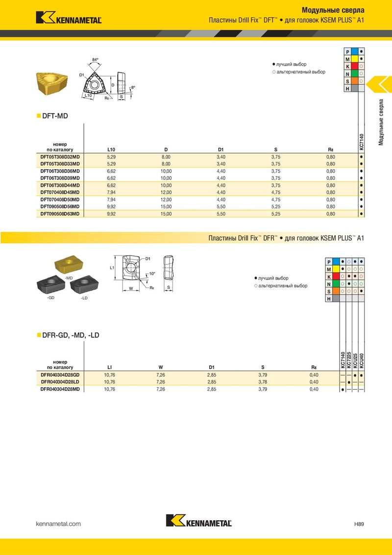 Модульные сверла Пластины Drill Fix™ DFT™ • для головок KSEM PLUS™ A1 P ⅷ M ⅷ ⅷ лучший выбор K ࠗ ࠗ альтернативный выбор N ࠗ S ࠗ H DFT-MD Модульные сверла номер KC7140 по каталогу L10 D D1 S R¡ DFT05T308D32MD 5,29 8,00 3,40 3,75 0,80 ⅷ DFT05T308D33MD 5,29 8,00 3,40 3,75 0,80 ⅷ DFT06T308D36MD 6,62 10,00 4,40 3,75 0,80 ⅷ DFT06T308D39MD 6,62 10,00 4,40 3,75 0,80 ⅷ DFT06T308D44MD 6,62 10,00 4,40 3,75 0,80 ⅷ DFT070408D45MD 7,94 12,00 4,40 4,75 0,80 ⅷ DFT070408D50MD 7,94 12,00 4,40 4,75 0,80 ⅷ DFT090508D56MD 9,92 15,00 5,50 5,25 0,80 ⅷ DFT090508D63MD 9,92 15,00 5,50 5,25 0,80 ⅷ Пластины Drill Fix™ DFR™ • для головок KSEM PLUS™ A1 P ⅷ ࠗ ⅷ ⅷ M ⅷ ࠗ ࠗ ࠗ -MD ⅷ лучший выбор K ࠗ ⅷ ⅷ ࠗ ࠗ альтернативный выбор N ࠗ ⅷ ࠗ ࠗ S ࠗ ࠗ ࠗ ⅷ -GD -LD H DFR-GD, -MD, -LD номер KC7140 KC7225 KCU25 KCU40 по каталогу LI W D1 S R¡ DFR040304D28GD 10,76 7,26 2,85 3,79 0,40 —— ⅷ ⅷ DFR040304D28LD 10,76 7,26 2,85 3,78 0,40 — ⅷ — — DFR040304D28MD 10,76 7,26 2,85 3,79 0,40 ⅷ — — — kennametal.com H89