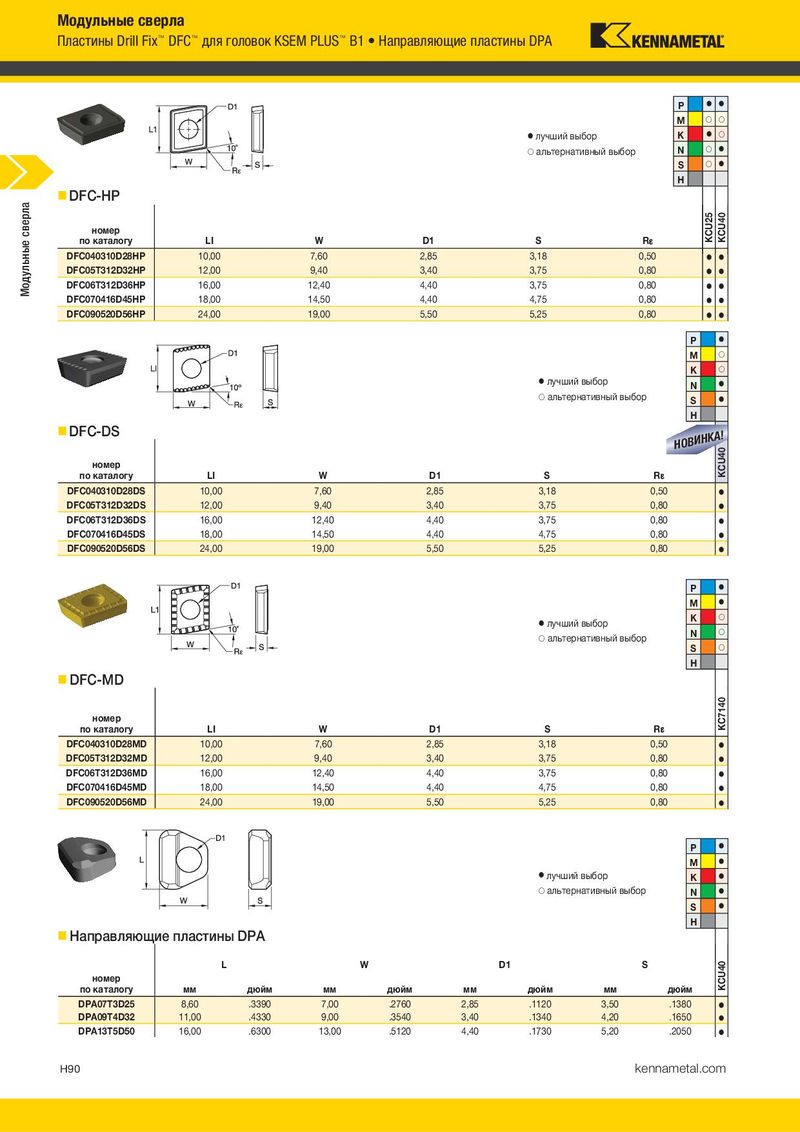 Модульные сверла Пластины Drill Fix™ DFC™ для головок KSEM PLUS™ B1 • Направляющие пластины DPA P ⅷ ⅷ M ࠗ ࠗ ⅷ лучший выбор K ⅷ ࠗ ࠗ альтернативный выбор N ࠗ ⅷ S ࠗ ⅷ H Модульные сверла DFC-HP номер KCU25 KCU40 по каталогу LI W D1 S R¡ DFC040310D28HP 10,00 7,60 2,85 3,18 0,50 ⅷ ⅷ DFC05T312D32HP 12,00 9,40 3,40 3,75 0,80 ⅷ ⅷ DFC06T312D36HP 16,00 12,40 4,40 3,75 0,80 ⅷ ⅷ DFC070416D45HP 18,00 14,50 4,40 4,75 0,80 ⅷ ⅷ DFC090520D56HP 24,00 19,00 5,50 5,25 0,80 ⅷ ⅷ P ⅷ M ࠗ K ࠗ ⅷ лучший выбор N ⅷ ࠗ альтернативный выбор S ⅷ H DFC-DS НОВИНКА! номер KCU40 по каталогу LI W D1 S R¡ DFC040310D28DS 10,00 7,60 2,85 3,18 0,50 ⅷ DFC05T312D32DS 12,00 9,40 3,40 3,75 0,80 ⅷ DFC06T312D36DS 16,00 12,40 4,40 3,75 0,80 ⅷ DFC070416D45DS 18,00 14,50 4,40 4,75 0,80 ⅷ DFC090520D56DS 24,00 19,00 5,50 5,25 0,80 ⅷ P ⅷ M ⅷ ⅷ лучший выбор K ࠗ ࠗ альтернативный выбор N ࠗ S ࠗ H DFC-MD номер KC7140 по каталогу LI W D1 S R¡ DFC040310D28MD 10,00 7,60 2,85 3,18 0,50 ⅷ DFC05T312D32MD 12,00 9,40 3,40 3,75 0,80 ⅷ DFC06T312D36MD 16,00 12,40 4,40 3,75 0,80 ⅷ DFC070416D45MD 18,00 14,50 4,40 4,75 0,80 ⅷ DFC090520D56MD 24,00 19,00 5,50 5,25 0,80 ⅷ P ⅷ M ⅷ ⅷ лучший выбор K ⅷ ࠗ альтернативный выбор N ⅷ S ⅷ H Направляющие пластины DPA L W D1 S KCU40 номер по каталогу мм дюйм мм дюйм мм дюйм мм дюйм DPA07T3D25 8,60 .3390 7,00 .2760 2,85 .1120 3,50 .1380 ⅷ DPA09T4D32 11,00 .4330 9,00 .3540 3,40 .1340 4,20 .1650 ⅷ DPA13T5D50 16,00 .6300 13,00 .5120 4,40 .1730 5,20 .2050 ⅷ H90 kennametal.com