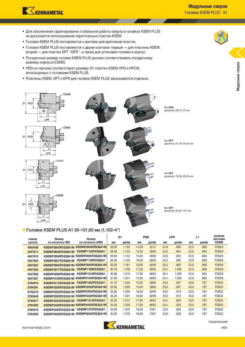 Модульные сверла Головки KSEM PLUS™ A1 • Для обеспечения гарантированно стабильной работы сверла в головках KSEM PLUS не допускается использование переточенных пластин KSEM. • Головки KSEM PLUS поставляются с винтами для крепления пластин. • Головки KSEM PLUS поставляются с двумя ключами: первый — для пластины KSEM, второй — для пластин DFT™/DFR™, а также для установки головки в корпус. • Посадочный размер головки KSEM PLUS должен соответствовать посадочному размеру корпуса (CSMS). Модульные сверла • PDD на чертеже соответствует размеру D1 пластин KSEM HPG и HPCM, используемых с головками KSEM PLUS. • Пластины KSEM, DFT и DFR для головок KSEM PLUS заказываются отдельно. 2 x DFR диаметр: 28–31,75 мм 2 x DFT диаметр: 31,75–70,34 мм CSMS D1 PDD 4 x DFT диаметр: 70,35–93,34 мм L1 LPR 6 x DFT диаметр: 93,35–127 мм Головки KSEM PLUS A1 28–101,60 мм (1,102–4"D) 1 PDD LPR L1 D1 PDD LPR L1 размер номер Номер Номер системы заказа по каталогу ISO по каталогу ANSI мм дюйм мм дюйм мм дюйм мм дюйм CSMS 4000408 KSEMP2800FDS28A1M KSEMP2800FDS28A1M 28,00 1.102 14,00 .5512 24,9 .980 22,0 .866 FDS28 4047811 KSEMP2858FDS28A1M KSEMP1125FDS28A1 28,58 1.125 15,00 .5906 25,0 .984 22,0 .866 FDS28 4047812 KSEMP2900FDS28A1M KSEMP2900FDS28A1M 29,00 1.142 15,00 .5906 25,0 .984 22,0 .866 FDS28 4047823 KSEMP2937FDS28A1M KSEMP1156FDS28A1 29,36 1.156 16,00 .6299 25,2 .992 22,0 .866 FDS28 4047824 KSEMP3000FDS28A1M KSEMP3000FDS28A1M 30,00 1.181 16,00 .6299 25,2 .992 22,0 .866 FDS28 4047825 KSEMP3017FDS28A1M KSEMP1188FDS28A1 30,18 1.188 17,00 .6693 25,4 1.000 22,0 .866 FDS28 4047826 KSEMP3096FDS28A1M KSEMP1219FDS28A1 30,96 1.219 17,00 .6693 25,4 1.000 22,0 .866 FDS28 4047827 KSEMP3100FDS28A1M KSEMP3100FDS28A1M 31,00 1.221 17,00 .6693 25,4 1.000 22,0 .866 FDS28 3794916 KSEMP3175FDS32A1M KSEMP1250FDS32A1 31,75 1.250 15,00 .5906 23,0 .907 20,0 .787 FDS32 3794291 KSEMP3200FDS32A1M KSEMP3200FDS32A1M 32,00 1.260 15,00 .5906 23,0 .907 20,0 .787 FDS32 3742210 KSEMP3300FDS32A1M KSEMP3300FDS32A1M 33,00 1.299 16,00 .6299 23,2 .913 20,0 .787 FDS32 3793949 KSEMP3320FDS32A1M KSEMP3320FDS32A1M 33,20 1.307 16,00 .6299 23,2 .913 20,0 .787 FDS32 3794917 KSEMP3334FDS32A1M KSEMP1313FDS32A1 33,35 1.313 17,00 .6693 23,4 .920 20,0 .787 FDS32 3794292 KSEMP3400FDS32A1M KSEMP3400FDS32A1M 34,00 1.339 17,00 .6693 23,4 .920 20,0 .787 FDS32 3794918 KSEMP3493FDS32A1M KSEMP1375FDS32A1 34,93 1.375 18,00 .7087 23,6 .928 20,0 .787 FDS32 3794393 KSEMP3500FDS32A1M KSEMP3500FDS32A1M 35,00 1.378 18,00 .7087 23,6 .928 20,0 .787 FDS32 (продолжение) kennametal.com H91