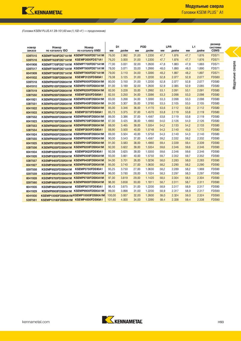 Модульные сверла Головки KSEM PLUS™ A1 (Головки KSEM PLUS A1 28–101,60 мм (1,102–4") — продолжение) D1 PDD LPR L1 размер номер Номер Номер D1 PDD LPR L1 системы заказа по каталогу ISO по каталогу ANSI мм дюйм мм дюйм мм дюйм мм дюйм CSMS 5397515 KSEMP7600FDS71A1M KSEMP7600FDS71A1M 76,00 2.992 31,00 1.2200 47,7 1.876 47,7 1.876 FDS71 5397516 KSEMP7620FDS71A1M KSEMP3000FDS71A1 76,20 3.000 31,00 1.2200 47,7 1.876 47,7 1.876 FDS71 Модульные сверла 6041908 KSEMP7700FDS71A1M KSEMP7700FDS71A1M 77,00 3.031 32,00 1.2600 47,8 1.883 47,8 1.883 FDS71 5397517 KSEMP7800FDS71A1M KSEMP7800FDS71A1M 78,00 3.071 33,00 1.2990 48,0 1.890 48,0 1.890 FDS71 6041909 KSEMP7900FDS71A1M KSEMP7900FDS71A1M 79,00 3.110 34,00 1.3390 48,2 1.897 48,2 1.897 FDS71 6041932 KSEMP7938FDS80A1M KSEMP3125FDS80A1 79,38 3.125 31,00 1.2200 52,8 2.077 52,8 2.077 FDS80 5397518 KSEMP8000FDS80A1M KSEMP8000FDS80A1M 80,00 3.150 31,00 1.2200 52,8 2.077 52,8 2.077 FDS80 6041910 KSEMP8100FDS80A1M KSEMP8100FDS80A1M 81,00 3.189 32,00 1.2600 52,9 2.085 52,9 2.085 FDS80 5397519 KSEMP8200FDS80A1M KSEMP8200FDS80A1M 82,00 3.228 33,00 1.2992 53,1 2.091 53,1 2.091 FDS80 5397550 KSEMP8255FDS80A1M KSEMP3250FDS80A1 82,55 3.250 34,00 1.3386 53,3 2.098 53,3 2.098 FDS80 6041921 KSEMP8300FDS80A1M KSEMP8300FDS80A1M 83,00 3.268 34,00 1.3390 53,3 2.098 53,3 2.098 FDS80 5397551 KSEMP8400FDS80A1M KSEMP8400FDS80A1M 84,00 3.307 35,00 1.3780 53,5 2.105 53,5 2.105 FDS80 6041922 KSEMP8500FDS80A1M KSEMP8500FDS80A1M 85,00 3.346 36,00 1.4170 53,6 2.112 53,6 2.112 FDS80 6041933 KSEMP8573FDS80A1M KSEMP3375FDS80A1 85,73 3.375 37,00 1.4570 53,8 2.119 53,8 2.119 FDS80 5397552 KSEMP8600FDS80A1M KSEMP8600FDS80A1M 86,00 3.386 37,00 1.4567 53,8 2.119 53,8 2.119 FDS80 6041923 KSEMP8700FDS80A1M KSEMP8700FDS80A1M 87,00 3.425 38,00 1.4960 54,0 2.126 54,0 2.126 FDS80 5397553 KSEMP8800FDS80A1M KSEMP8800FDS80A1M 88,00 3.465 39,00 1.5354 54,2 2.133 54,2 2.133 FDS80 5397554 KSEMP8890FDS80A1M KSEMP3500FDS80A1 88,90 3.500 40,00 1.5748 54,3 2.140 45,0 1.772 FDS80 6041924 KSEMP8900FDS80A1M KSEMP8900FDS80A1M 89,00 3.504 40,00 1.5750 54,3 2.140 54,3 2.140 FDS80 5397555 KSEMP9000FDS90A1M KSEMP9000FDS90A1M 90,00 3.543 37,00 1.4567 59,2 2.332 59,2 2.332 FDS90 6041925 KSEMP9100FDS90A1M KSEMP9100FDS90A1M 91,00 3.583 38,00 1.4960 59,4 2.339 59,4 2.339 FDS90 5397556 KSEMP9200FDS90A1M KSEMP9200FDS90A1M 92,00 3.622 39,00 1.5354 59,6 2.346 59,6 2.346 FDS90 6041934 KSEMP9208FDS90A1M KSEMP3625FDS90A1 92,08 3.625 39,00 1.5350 59,6 2.346 59,6 2.346 FDS90 6041926 KSEMP9300FDS90A1M KSEMP9300FDS90A1M 93,00 3.661 40,00 1.5750 59,7 2.352 59,7 2.352 FDS90 5397557 KSEMP9400FDS90A1M KSEMP9400FDS90A1M 94,00 3.701 26,00 1.0236 58,0 2.283 58,0 2.283 FDS90 6041927 KSEMP9500FDS90A1M KSEMP9500FDS90A1M 95,00 3.740 27,00 1.0630 58,2 2.290 58,2 2.290 FDS90 5397558 KSEMP9525FDS90A1M KSEMP3750FDS90A1 95,25 3.750 27,00 1.0630 58,2 2.289 58,2 1.969 FDS90 5397559 KSEMP9600FDS90A1M KSEMP9600FDS90A1M 96,00 3.780 28,00 1.1024 58,3 2.297 58,3 2.297 FDS90 6041928 KSEMP9700FDS90A1M KSEMP9700FDS90A1M 97,00 3.819 29,00 1.1420 58,5 2.304 58,5 2.304 FDS90 5397560 KSEMP9800FDS90A1M KSEMP9800FDS90A1M 98,00 3.858 30,00 1.1811 58,7 2.311 58,7 2.311 FDS90 6041935 KSEMP9843FDS90A1M KSEMP3875FDS90A1 98,43 3.875 31,00 1.2200 58,9 2.317 58,9 2.317 FDS90 6041929 KSEMP9900FDS90A1M KSEMP9900FDS90A1M 99,00 3.898 31,00 1.2200 58,9 2.317 58,9 2.317 FDS90 6041930 KSEMP10000FDS90A1M KSEMP10000FDS90A1M 100,00 3.937 32,00 1.2600 59,0 2.324 59,0 2.324 FDS90 5397561 KSEMP10160FDS90A1M KSEMP4000FDS90A1 101,60 4.000 34,00 1.3390 59,4 2.338 59,4 2.338 FDS90 kennametal.com H93