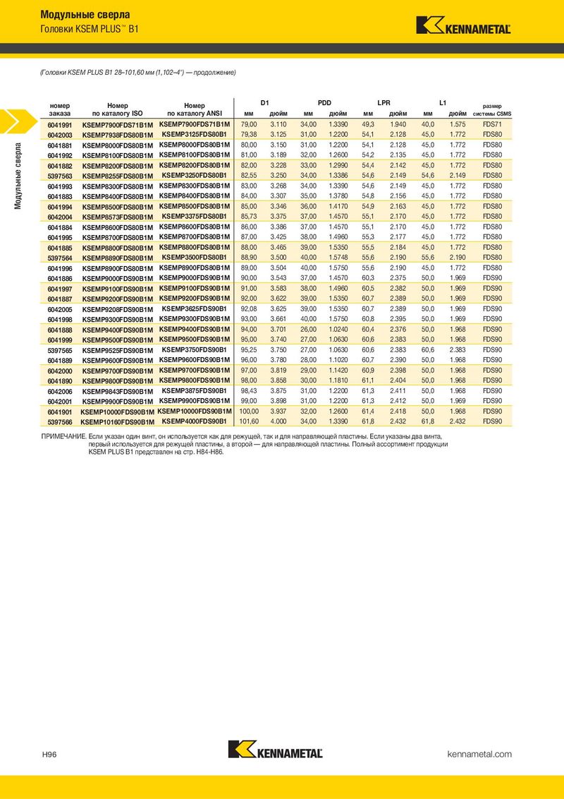 Модульные сверла Головки KSEM PLUS™ B1 (Головки KSEM PLUS B1 28–101,60 мм (1,102–4") — продолжение) D1 PDD LPR L1 номер Номер Номер D1 PDD LPR L1 размер заказа по каталогу ISO по каталогу ANSI мм дюйм мм дюйм мм дюйм мм дюйм системы CSMS 6041991 KSEMP7900FDS71B1M KSEMP7900FDS71B1M 79,00 3.110 34,00 1.3390 49,3 1.940 40,0 1.575 FDS71 6042003 KSEMP7938FDS80B1M KSEMP3125FDS80B1 79,38 3.125 31,00 1.2200 54,1 2.128 45,0 1.772 FDS80 Модульные сверла 6041881 KSEMP8000FDS80B1M KSEMP8000FDS80B1M 80,00 3.150 31,00 1.2200 54,1 2.128 45,0 1.772 FDS80 6041992 KSEMP8100FDS80B1M KSEMP8100FDS80B1M 81,00 3.189 32,00 1.2600 54,2 2.135 45,0 1.772 FDS80 6041882 KSEMP8200FDS80B1M KSEMP8200FDS80B1M 82,00 3.228 33,00 1.2990 54,4 2.142 45,0 1.772 FDS80 5397563 KSEMP8255FDS80B1M KSEMP3250FDS80B1 82,55 3.250 34,00 1.3386 54,6 2.149 54,6 2.149 FDS80 6041993 KSEMP8300FDS80B1M KSEMP8300FDS80B1M 83,00 3.268 34,00 1.3390 54,6 2.149 45,0 1.772 FDS80 6041883 KSEMP8400FDS80B1M KSEMP8400FDS80B1M 84,00 3.307 35,00 1.3780 54,8 2.156 45,0 1.772 FDS80 6041994 KSEMP8500FDS80B1M KSEMP8500FDS80B1M 85,00 3.346 36,00 1.4170 54,9 2.163 45,0 1.772 FDS80 6042004 KSEMP8573FDS80B1M KSEMP3375FDS80B1 85,73 3.375 37,00 1.4570 55,1 2.170 45,0 1.772 FDS80 6041884 KSEMP8600FDS80B1M KSEMP8600FDS80B1M 86,00 3.386 37,00 1.4570 55,1 2.170 45,0 1.772 FDS80 6041995 KSEMP8700FDS80B1M KSEMP8700FDS80B1M 87,00 3.425 38,00 1.4960 55,3 2.177 45,0 1.772 FDS80 6041885 KSEMP8800FDS80B1M KSEMP8800FDS80B1M 88,00 3.465 39,00 1.5350 55,5 2.184 45,0 1.772 FDS80 5397564 KSEMP8890FDS80B1M KSEMP3500FDS80B1 88,90 3.500 40,00 1.5748 55,6 2.190 55,6 2.190 FDS80 6041996 KSEMP8900FDS80B1M KSEMP8900FDS80B1M 89,00 3.504 40,00 1.5750 55,6 2.190 45,0 1.772 FDS80 6041886 KSEMP9000FDS90B1M KSEMP9000FDS90B1M 90,00 3.543 37,00 1.4570 60,3 2.375 50,0 1.969 FDS90 6041997 KSEMP9100FDS90B1M KSEMP9100FDS90B1M 91,00 3.583 38,00 1.4960 60,5 2.382 50,0 1.969 FDS90 6041887 KSEMP9200FDS90B1M KSEMP9200FDS90B1M 92,00 3.622 39,00 1.5350 60,7 2.389 50,0 1.969 FDS90 6042005 KSEMP9208FDS90B1M KSEMP3625FDS90B1 92,08 3.625 39,00 1.5350 60,7 2.389 50,0 1.969 FDS90 6041998 KSEMP9300FDS90B1M KSEMP9300FDS90B1M 93,00 3.661 40,00 1.5750 60,8 2.395 50,0 1.969 FDS90 6041888 KSEMP9400FDS90B1M KSEMP9400FDS90B1M 94,00 3.701 26,00 1.0240 60,4 2.376 50,0 1.968 FDS90 6041999 KSEMP9500FDS90B1M KSEMP9500FDS90B1M 95,00 3.740 27,00 1.0630 60,6 2.383 50,0 1.968 FDS90 5397565 KSEMP9525FDS90B1M KSEMP3750FDS90B1 95,25 3.750 27,00 1.0630 60,6 2.383 60,6 2.383 FDS90 6041889 KSEMP9600FDS90B1M KSEMP9600FDS90B1M 96,00 3.780 28,00 1.1020 60,7 2.390 50,0 1.968 FDS90 6042000 KSEMP9700FDS90B1M KSEMP9700FDS90B1M 97,00 3.819 29,00 1.1420 60,9 2.398 50,0 1.968 FDS90 6041890 KSEMP9800FDS90B1M KSEMP9800FDS90B1M 98,00 3.858 30,00 1.1810 61,1 2.404 50,0 1.968 FDS90 6042006 KSEMP9843FDS90B1M KSEMP3875FDS90B1 98,43 3.875 31,00 1.2200 61,3 2.411 50,0 1.968 FDS90 6042001 KSEMP9900FDS90B1M KSEMP9900FDS90B1M 99,00 3.898 31,00 1.2200 61,3 2.412 50,0 1.969 FDS90 6041901 KSEMP10000FDS90B1M KSEMP10000FDS90B1M 100,00 3.937 32,00 1.2600 61,4 2.418 50,0 1.968 FDS90 5397566 KSEMP10160FDS90B1M KSEMP4000FDS90B1 101,60 4.000 34,00 1.3390 61,8 2.432 61,8 2.432 FDS90 ПРИМЕЧАНИЕ. Если указан один винт, он используется как для режущей, так и для направляющей пластины. Если указаны два винта, первый используется для режущей пластины, а второй — для направляющей пластины. Полный ассортимент продукции KSEM PLUS B1 представлен на стр. H84-H86. H96 kennametal.com
