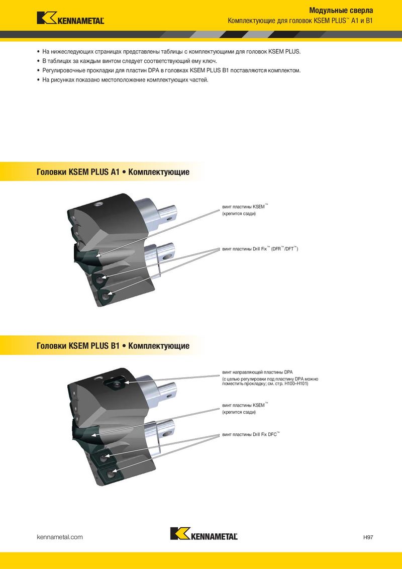 Модульные сверла Комплектующие для головок KSEM PLUS™ A1 и B1 • На нижеследующих страницах представлены таблицы с комплектующими для головок KSEM PLUS. • В таблицах за каждым винтом следует соответствующий ему ключ. • Регулировочные прокладки для пластин DPA в головках KSEM PLUS B1 поставляются комплектом. • На рисунках показано местоположение комплектующих частей. Головки KSEM PLUS A1 • Комплектующие винт пластины KSEM™ (крепится сзади) винт пластины Drill Fix™ (DFR™/DFT™) Головки KSEM PLUS B1 • Комплектующие винт направляющей пластины DPA (с целью регулировки под пластину DPA можно поместить прокладку; см. стр. H100–H101) винт пластины KSEM™ (крепится сзади) винт пластины Drill Fix DFC™ kennametal.com H97