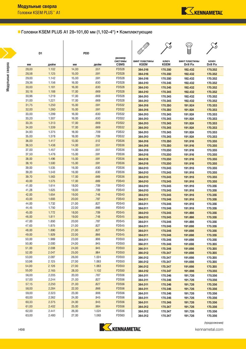 Модульные сверла Головки KSEM PLUS™ A1 Головки KSEM PLUS A1 28–101,60 мм (1,102–4") • Комплектующие D1 PDD размер Модульные сверла системы винт пластины ключ винт пластины ключ мм дюйм мм дюйм CSMS KSEM KSEM Drill Fix Drill Fix 28,00 1.102 14,00 .551 FDS28 364.016 170.350 192.432 170.352 28,58 1.125 15,00 .591 FDS28 364.016 170.350 192.432 170.352 29,00 1.142 15,00 .591 FDS28 364.016 170.350 192.432 170.352 29,36 1.156 16,00 .630 FDS28 364.010 170.345 192.432 170.352 30,00 1.181 16,00 .630 FDS28 364.010 170.345 192.432 170.352 30,18 1.188 17,00 .669 FDS28 364.010 170.345 192.432 170.352 30,96 1.219 17,00 .669 FDS28 364.010 170.345 192.432 170.352 31,00 1.221 17,00 .669 FDS28 364.010 170.345 192.432 170.352 31,75 1.250 15,00 .591 FDS32 364.016 170.350 191.924 170.353 32,00 1.260 15,00 .591 FDS32 364.016 170.350 191.924 170.353 33,00 1.299 16,00 .630 FDS32 364.010 170.345 191.924 170.353 33,20 1.307 16,00 .630 FDS32 364.010 170.345 191.924 170.353 33,35 1.313 17,00 .669 FDS32 364.010 170.345 191.924 170.353 34,00 1.339 17,00 .669 FDS32 364.010 170.345 191.924 170.353 34,93 1.375 18,00 .709 FDS32 364.010 170.345 191.924 170.353 35,00 1.378 18,00 .709 FDS32 364.010 170.345 191.924 170.353 36,00 1.417 13,00 .512 FDS36 364.016 170.350 191.916 170.355 36,53 1.438 14,00 .551 FDS36 364.016 170.350 191.916 170.355 37,00 1.457 14,00 .551 FDS36 364.016 170.350 191.916 170.355 37,50 1.476 15,00 .591 FDS36 364.016 170.350 191.916 170.355 38,00 1.496 15,00 .591 FDS36 364.016 170.350 191.916 170.355 38,10 1.500 15,00 .591 FDS36 364.016 170.350 191.916 170.355 39,00 1.535 16,00 .630 FDS36 364.010 170.345 191.916 170.355 39,20 1.543 16,00 .630 FDS36 364.010 170.345 191.916 170.355 39,70 1.563 17,00 .669 FDS36 364.010 170.345 191.916 170.355 40,00 1.575 17,00 .669 FDS40 364.010 170.345 191.916 170.355 41,00 1.614 18,00 .709 FDS40 364.010 170.345 191.916 170.355 41,28 1.625 18,00 .709 FDS40 364.010 170.345 191.916 170.355 42,00 1.654 19,00 .748 FDS40 364.010 170.345 191.916 170.355 43,00 1.693 20,00 .787 FDS40 364.011 170.346 191.916 170.355 44,00 1.732 21,00 .827 FDS40 364.011 170.346 191.916 170.355 44,45 1.750 22,00 .866 FDS40 364.011 170.346 191.916 170.355 45,00 1.772 18,00 .709 FDS45 364.010 170.345 191.698 170.355 46,00 1.811 19,00 .748 FDS45 364.010 170.345 191.698 170.355 47,00 1.850 20,00 .787 FDS45 364.011 170.346 191.698 170.355 47,63 1.875 21,00 .827 FDS45 364.011 170.346 191.698 170.355 48,00 1.890 21,00 .827 FDS45 364.011 170.346 191.698 170.355 49,00 1.929 22,00 .866 FDS45 364.011 170.346 191.698 170.355 50,00 1.969 23,00 .906 FDS50 364.011 170.346 191.698 170.355 50,80 2.000 24,00 .945 FDS50 364.011 170.346 191.698 170.355 51,00 2.008 24,00 .945 FDS50 364.011 170.346 191.698 170.355 52,00 2.047 25,00 .984 FDS50 364.012 170.347 191.698 170.355 53,00 2.087 26,00 1.024 FDS50 364.012 170.347 191.698 170.355 53,98 2.125 27,00 1.063 FDS50 364.012 170.347 191.698 170.355 54,00 2.126 27,00 1.063 FDS50 364.012 170.347 191.698 170.355 55,00 2.165 28,00 1.102 FDS50 364.012 170.347 191.698 170.355 56,00 2.205 20,00 .787 FDS56 364.011 170.346 191.726 170.356 57,00 2.244 21,00 .827 FDS56 364.011 170.346 191.726 170.356 57,15 2.250 21,00 .827 FDS56 364.011 170.346 191.726 170.356 58,00 2.284 22,00 .866 FDS56 364.011 170.346 191.726 170.356 59,00 2.323 23,00 .906 FDS56 364.011 170.346 191.726 170.356 60,00 2.362 24,00 .945 FDS56 364.011 170.346 191.726 170.356 60,33 2.375 24,00 .945 FDS56 364.011 170.346 191.726 170.356 61,00 2.402 25,00 .984 FDS56 364.012 170.347 191.726 170.356 62,00 2.441 26,00 1.024 FDS56 364.012 170.347 191.726 170.356 63,00 2.480 27,00 1.063 FDS63 364.012 170.347 191.726 170.356 (продолжение) H98 kennametal.com