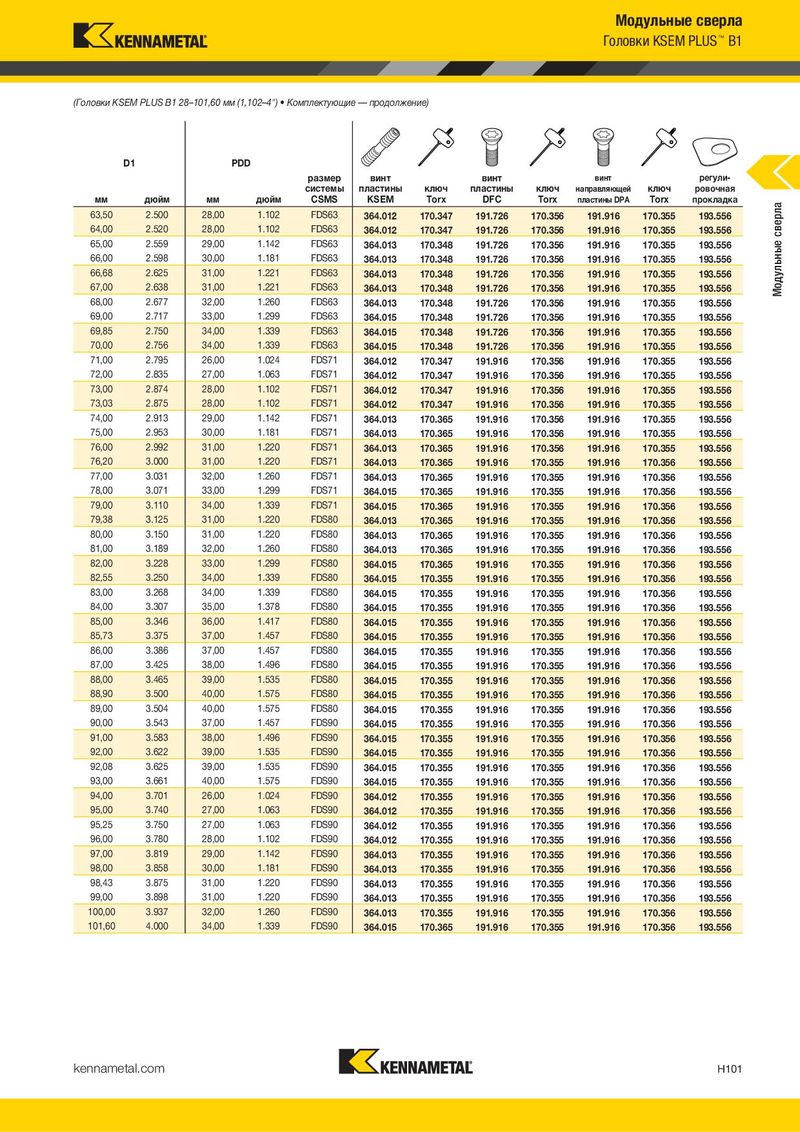 Модульные сверла Головки KSEM PLUS™ B1 (Головки KSEM PLUS B1 28–101,60 мм (1,102–4") • Комплектующие — продолжение) D1 PDD размер винт винт винт регули- системы пластины ключ пластины ключ направляющей ключ ровочная мм дюйм мм дюйм CSMS KSEM Torx DFC Torx пластины DPA Torx прокладка Модульные сверла 63,50 2.500 28,00 1.102 FDS63 364.012 170.347 191.726 170.356 191.916 170.355 193.556 64,00 2.520 28,00 1.102 FDS63 364.012 170.347 191.726 170.356 191.916 170.355 193.556 65,00 2.559 29,00 1.142 FDS63 364.013 170.348 191.726 170.356 191.916 170.355 193.556 66,00 2.598 30,00 1.181 FDS63 364.013 170.348 191.726 170.356 191.916 170.355 193.556 66,68 2.625 31,00 1.221 FDS63 364.013 170.348 191.726 170.356 191.916 170.355 193.556 67,00 2.638 31,00 1.221 FDS63 364.013 170.348 191.726 170.356 191.916 170.355 193.556 68,00 2.677 32,00 1.260 FDS63 364.013 170.348 191.726 170.356 191.916 170.355 193.556 69,00 2.717 33,00 1.299 FDS63 364.015 170.348 191.726 170.356 191.916 170.355 193.556 69,85 2.750 34,00 1.339 FDS63 364.015 170.348 191.726 170.356 191.916 170.355 193.556 70,00 2.756 34,00 1.339 FDS63 364.015 170.348 191.726 170.356 191.916 170.355 193.556 71,00 2.795 26,00 1.024 FDS71 364.012 170.347 191.916 170.356 191.916 170.355 193.556 72,00 2.835 27,00 1.063 FDS71 364.012 170.347 191.916 170.356 191.916 170.355 193.556 73,00 2.874 28,00 1.102 FDS71 364.012 170.347 191.916 170.356 191.916 170.355 193.556 73,03 2.875 28,00 1.102 FDS71 364.012 170.347 191.916 170.356 191.916 170.355 193.556 74,00 2.913 29,00 1.142 FDS71 364.013 170.365 191.916 170.356 191.916 170.355 193.556 75,00 2.953 30,00 1.181 FDS71 364.013 170.365 191.916 170.356 191.916 170.355 193.556 76,00 2.992 31,00 1.220 FDS71 364.013 170.365 191.916 170.356 191.916 170.355 193.556 76,20 3.000 31,00 1.220 FDS71 364.013 170.365 191.916 170.355 191.916 170.356 193.556 77,00 3.031 32,00 1.260 FDS71 364.013 170.365 191.916 170.355 191.916 170.356 193.556 78,00 3.071 33,00 1.299 FDS71 364.015 170.365 191.916 170.355 191.916 170.356 193.556 79,00 3.110 34,00 1.339 FDS71 364.015 170.365 191.916 170.355 191.916 170.356 193.556 79,38 3.125 31,00 1.220 FDS80 364.013 170.365 191.916 170.355 191.916 170.356 193.556 80,00 3.150 31,00 1.220 FDS80 364.013 170.365 191.916 170.355 191.916 170.356 193.556 81,00 3.189 32,00 1.260 FDS80 364.013 170.365 191.916 170.355 191.916 170.356 193.556 82,00 3.228 33,00 1.299 FDS80 364.015 170.365 191.916 170.355 191.916 170.356 193.556 82,55 3.250 34,00 1.339 FDS80 364.015 170.355 191.916 170.355 191.916 170.356 193.556 83,00 3.268 34,00 1.339 FDS80 364.015 170.355 191.916 170.355 191.916 170.356 193.556 84,00 3.307 35,00 1.378 FDS80 364.015 170.355 191.916 170.355 191.916 170.356 193.556 85,00 3.346 36,00 1.417 FDS80 364.015 170.355 191.916 170.355 191.916 170.356 193.556 85,73 3.375 37,00 1.457 FDS80 364.015 170.355 191.916 170.355 191.916 170.356 193.556 86,00 3.386 37,00 1.457 FDS80 364.015 170.355 191.916 170.355 191.916 170.356 193.556 87,00 3.425 38,00 1.496 FDS80 364.015 170.355 191.916 170.355 191.916 170.356 193.556 88,00 3.465 39,00 1.535 FDS80 364.015 170.355 191.916 170.355 191.916 170.356 193.556 88,90 3.500 40,00 1.575 FDS80 364.015 170.355 191.916 170.355 191.916 170.356 193.556 89,00 3.504 40,00 1.575 FDS80 364.015 170.355 191.916 170.355 191.916 170.356 193.556 90,00 3.543 37,00 1.457 FDS90 364.015 170.355 191.916 170.355 191.916 170.356 193.556 91,00 3.583 38,00 1.496 FDS90 364.015 170.355 191.916 170.355 191.916 170.356 193.556 92,00 3.622 39,00 1.535 FDS90 364.015 170.355 191.916 170.355 191.916 170.356 193.556 92,08 3.625 39,00 1.535 FDS90 364.015 170.355 191.916 170.355 191.916 170.356 193.556 93,00 3.661 40,00 1.575 FDS90 364.015 170.355 191.916 170.355 191.916 170.356 193.556 94,00 3.701 26,00 1.024 FDS90 364.012 170.355 191.916 170.355 191.916 170.356 193.556 95,00 3.740 27,00 1.063 FDS90 364.012 170.355 191.916 170.355 191.916 170.356 193.556 95,25 3.750 27,00 1.063 FDS90 364.012 170.355 191.916 170.355 191.916 170.356 193.556 96,00 3.780 28,00 1.102 FDS90 364.012 170.355 191.916 170.355 191.916 170.356 193.556 97,00 3.819 29,00 1.142 FDS90 364.013 170.355 191.916 170.355 191.916 170.356 193.556 98,00 3.858 30,00 1.181 FDS90 364.013 170.355 191.916 170.355 191.916 170.356 193.556 98,43 3.875 31,00 1.220 FDS90 364.013 170.355 191.916 170.355 191.916 170.356 193.556 99,00 3.898 31,00 1.220 FDS90 364.013 170.355 191.916 170.355 191.916 170.356 193.556 100,00 3.937 32,00 1.260 FDS90 364.013 170.355 191.916 170.355 191.916 170.356 193.556 101,60 4.000 34,00 1.339 FDS90 364.015 170.365 191.916 170.355 191.916 170.356 193.556 kennametal.com H101