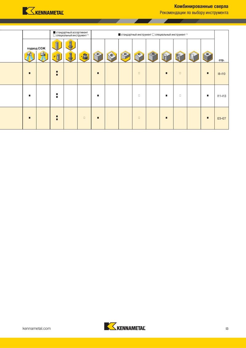 Комбинированные сверла Рекомендации по выбору инструмента Ⅵ стандартный ассортимент Ⅵ стандартный инструмент Ⅺ специальный инструмент 1) Ⅺ специальный инструмент 1) подвод СОЖ стр. Ⅵ Ⅵ Ⅵ Ⅺ Ⅵ Ⅺ Ⅵ I8–I10 Ⅵ Ⅵ Ⅵ Ⅵ Ⅺ Ⅵ Ⅺ Ⅵ I11–I13 Ⅵ Ⅵ Ⅵ Ⅺ Ⅵ Ⅺ Ⅵ Ⅵ I23–I27 Ⅵ kennametal.com I3