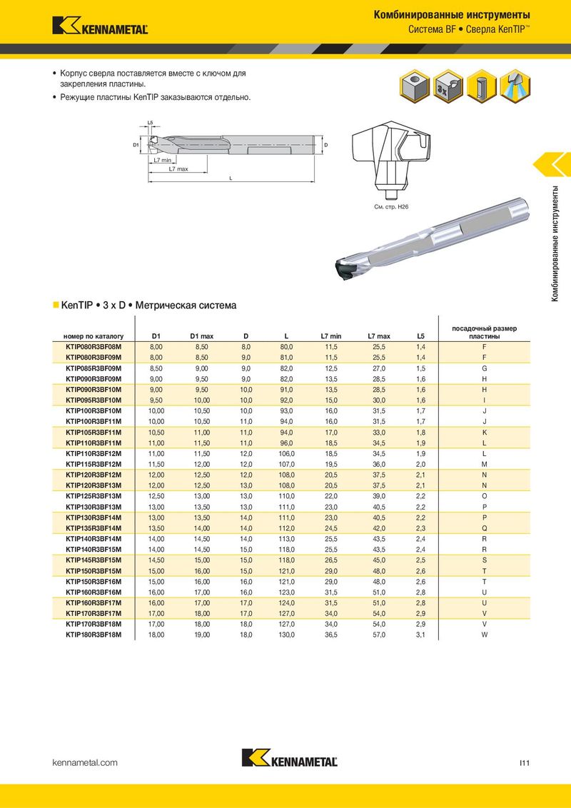 Комбинированные инструменты Система BF • Сверла KenTIP™ • Корпус сверла поставляется вместе с ключом для закрепления пластины. • Режущие пластины KenTIP заказываются отдельно. L7 min L7 max См. стр. H26 Комбинированные инструменты KenTIP • 3 x D • Метрическая система посадочный размер номер по каталогу D1 D1 max D L L7 min L7 max L5 пластины KTIP080R3BF08M 8,00 8,50 8,0 80,0 11,5 25,5 1,4 F KTIP080R3BF09M 8,00 8,50 9,0 81,0 11,5 25,5 1,4 F KTIP085R3BF09M 8,50 9,00 9,0 82,0 12,5 27,0 1,5 G KTIP090R3BF09M 9,00 9,50 9,0 82,0 13,5 28,5 1,6 H KTIP090R3BF10M 9,00 9,50 10,0 91,0 13,5 28,5 1,6 H KTIP095R3BF10M 9,50 10,00 10,0 92,0 15,0 30,0 1,6 I KTIP100R3BF10M 10,00 10,50 10,0 93,0 16,0 31,5 1,7 J KTIP100R3BF11M 10,00 10,50 11,0 94,0 16,0 31,5 1,7 J KTIP105R3BF11M 10,50 11,00 11,0 94,0 17,0 33,0 1,8 K KTIP110R3BF11M 11,00 11,50 11,0 96,0 18,5 34,5 1,9 L KTIP110R3BF12M 11,00 11,50 12,0 106,0 18,5 34,5 1,9 L KTIP115R3BF12M 11,50 12,00 12,0 107,0 19,5 36,0 2,0 M KTIP120R3BF12M 12,00 12,50 12,0 108,0 20,5 37,5 2,1 N KTIP120R3BF13M 12,00 12,50 13,0 108,0 20,5 37,5 2,1 N KTIP125R3BF13M 12,50 13,00 13,0 110,0 22,0 39,0 2,2 O KTIP130R3BF13M 13,00 13,50 13,0 111,0 23,0 40,5 2,2 P KTIP130R3BF14M 13,00 13,50 14,0 111,0 23,0 40,5 2,2 P KTIP135R3BF14M 13,50 14,00 14,0 112,0 24,5 42,0 2,3 Q KTIP140R3BF14M 14,00 14,50 14,0 113,0 25,5 43,5 2,4 R KTIP140R3BF15M 14,00 14,50 15,0 118,0 25,5 43,5 2,4 R KTIP145R3BF15M 14,50 15,00 15,0 118,0 26,5 45,0 2,5 S KTIP150R3BF15M 15,00 16,00 15,0 121,0 29,0 48,0 2,6 T KTIP150R3BF16M 15,00 16,00 16,0 121,0 29,0 48,0 2,6 T KTIP160R3BF16M 16,00 17,00 16,0 123,0 31,5 51,0 2,8 U KTIP160R3BF17M 16,00 17,00 17,0 124,0 31,5 51,0 2,8 U KTIP170R3BF17M 17,00 18,00 17,0 127,0 34,0 54,0 2,9 V KTIP170R3BF18M 17,00 18,00 18,0 127,0 34,0 54,0 2,9 V KTIP180R3BF18M 18,00 19,00 18,0 130,0 36,5 57,0 3,1 W kennametal.com I11