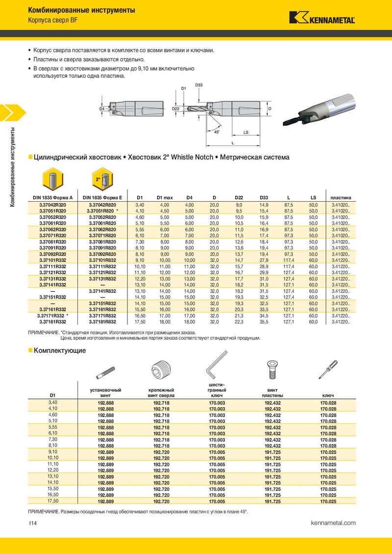 Комбинированные инструменты Корпуса сверл BF • Корпус сверла поставляется в комплекте со всеми винтами и ключами. • Пластины и сверла заказываются отдельно. • В сверлах с хвостовиками диаметром до 9,10 мм включительно используется только одна пластина. Комбинированные инструменты Цилиндрический хвостовик • Хвостовик 2° Whistle Notch • Метрическая система DIN 1835 Форма A DIN 1835 Форма E D1 D1 max D4 D D22 D33 L LS пластина 3.37042R320 3.37042R820 3,40 4,00 4,00 20,0 9,0 14,9 87,5 50,0 3.41020.. 3.37051R320 3.37051R820 * 4,10 4,50 5,00 20,0 9,5 15,4 87,5 50,0 3.41020.. 3.37052R320 3.37052R820 4,60 5,00 5,00 20,0 10,0 15,9 87,5 50,0 3.41020.. 3.37061R320 3.37061R820 5,10 5,50 6,00 20,0 10,5 16,4 87,5 50,0 3.41020.. 3.37062R320 3.37062R820 5,55 6,00 6,00 20,0 11,0 16,9 87,5 50,0 3.41020.. 3.37071R320 3.37071R820 6,10 7,00 7,00 20,0 11,5 17,4 97,3 50,0 3.41020.. 3.37081R320 3.37081R820 7,30 8,00 8,00 20,0 12,6 18,4 97,3 50,0 3.41020.. 3.37091R320 3.37091R820 8,10 9,00 9,00 20,0 13,6 19,4 97,3 50,0 3.41020.. 3.37092R320 3.37092R820 8,10 9,00 9,00 20,0 13,7 19,4 97,3 50,0 3.41020.. 3.37101R332 3.37101R832 9,10 10,00 10,00 32,0 14,7 27,9 117,4 60,0 3.41220.. 3.37111R332 3.37111R832 10,10 11,00 11,00 32,0 15,7 28,9 117,4 60,0 3.41220.. 3.37121R332 3.37121R832 11,10 12,00 12,00 32,0 16,7 29,9 127,4 60,0 3.41220.. 3.37131R332 3.37131R832 12,20 13,00 13,00 32,0 17,7 31,0 127,4 60,0 3.41220.. 3.37141R332 — 13,10 14,00 14,00 32,0 18,2 31,5 127,1 60,0 3.41220.. — 3.37141R832 13,10 14,00 14,00 32,0 18,2 31,5 127,4 60,0 3.41220.. 3.37151R332 — 14,10 15,00 15,00 32,0 19,3 32,5 127,4 60,0 3.41220.. — 3.37151R832 14,10 15,00 15,00 32,0 19,3 32,5 127,1 60,0 3.41220.. 3.37161R332 3.37161R832 15,50 16,00 16,00 32,0 20,3 33,5 127,1 60,0 3.41220.. 3.37171R332 * 3.37171R832 16,50 17,00 17,00 32,0 21,3 34,5 127,1 60,0 3.41220.. 3.37181R332 3.37181R832 17,50 18,00 18,00 32,0 22,3 35,5 127,1 60,0 3.41220.. ПРИМЕЧАНИЕ. *Стандартная позиция. Изготавливается при размещении заказа. Цена, время изготовления и минимальная партия заказа соответствуют стандартной продукции. Комплектующие шести- установочный крепежный гранный винт D1 винт винт сверла ключ пластины ключ 3,40 192.888 192.718 170.003 192.432 170.028 4,10 192.888 192.718 170.003 192.432 170.028 4,60 192.888 192.718 170.003 192.432 170.028 5,10 192.888 192.718 170.003 192.432 170.028 5,55 192.888 192.718 170.003 192.432 170.028 6,10 192.888 192.718 170.003 192.432 170.028 7,30 192.888 192.718 170.003 192.432 170.028 8,10 192.888 192.718 170.003 192.432 170.028 9,10 192.889 192.720 170.005 191.725 170.025 10,10 192.889 192.720 170.005 191.725 170.025 11,10 192.889 192.720 170.005 191.725 170.025 12,20 192.889 192.720 170.005 191.725 170.025 13,10 192.889 192.720 170.005 191.725 170.025 14,10 192.889 192.720 170.005 191.725 170.025 15,50 192.889 192.720 170.005 191.725 170.025 16,50 192.889 192.720 170.005 191.725 170.025 17,50 192.889 192.720 170.005 191.725 170.025 ПРИМЕЧАНИЕ. Размеры посадочных гнезд обеспечивают позиционирование пластин с углом в плане 45°. I14 kennametal.com