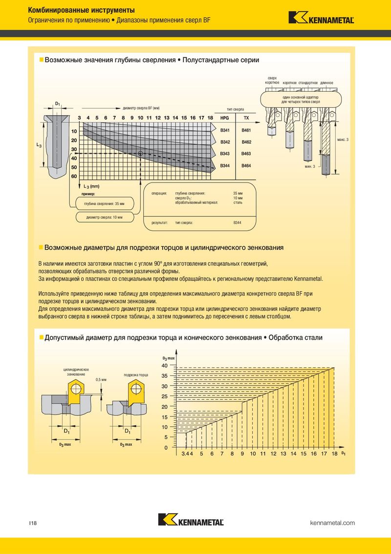 Комбинированные инструменты Ограничения по применению • Диапазоны применения сверл BF Возможные значения глубины сверления • Полустандартные серии сверх короткое короткое стандартное длинное один основной адаптер для четырех типов сверл диаметр сверла BF (мм) тип сверла макс. 3 мин. 3 пример: операция: глубина сверления: 35 мм сверло D1: 10 мм глубина сверления: 35 мм обрабатываемый материал: сталь диаметр сверла: 10 мм результат: тип сверла: B344 Возможные диаметры для подрезки торцов и цилиндрического зенкования В наличии имеются заготовки пластин с углом 90º для изготовления специальных геометрий, позволяющих обрабатывать отверстия различной формы. За информацией о пластинах со специальным профилем обращайтесь к региональному представителю Kennametal. Используйте приведенную ниже таблицу для определения максимального диаметра конкретного сверла BF при подрезке торцов и цилиндрическом зенковании. Для определения максимального диаметра для подрезки торца или цилиндрического зенкования найдите диаметр выбранного сверла в нижней строке таблицы, а затем поднимитесь до пересечения с левым столбцом. Допустимый диаметр для подрезки торца и конического зенкования • Обработка стали D3 max цилиндрическое зенкование подрезка торца 0,5 мм D3 max D3 max D1 I18 kennametal.com