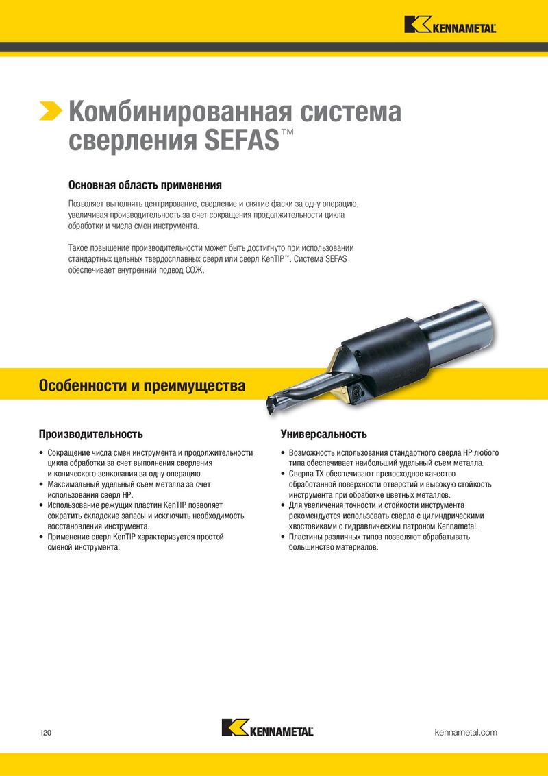 Комбинированная система сверления SEFAS™ Основная область применения Позволяет выполнять центрирование, сверление и снятие фаски за одну операцию, увеличивая производительность за счет сокращения продолжительности цикла обработки и числа смен инструмента. Такое повышение производительности может быть достигнуто при использовании стандартных цельных твердосплавных сверл или сверл KenTIP™. Система SEFAS обеспечивает внутренний подвод СОЖ. Особенности и преимущества Производительность Универсальность • Сокращение числа смен инструмента и продолжительности • Возможность использования стандартного сверла HP любого цикла обработки за счет выполнения сверления типа обеспечивает наибольший удельный съем металла. и конического зенкования за одну операцию. • Сверла TX обеспечивают превосходное качество • Максимальный удельный съем металла за счет обработанной поверхности отверстий и высокую стойкость использования сверл HP. инструмента при обработке цветных металлов. • Использование режущих пластин KenTIP позволяет • Для увеличения точности и стойкости инструмента сократить складские запасы и исключить необходимость рекомендуется использовать сверла с цилиндрическими восстановления инструмента. хвостовиками с гидравлическим патроном Kennametal. • Применение сверл KenTIP характеризуется простой • Пластины различных типов позволяют обрабатывать сменой инструмента. большинство материалов. I20 kennametal.com