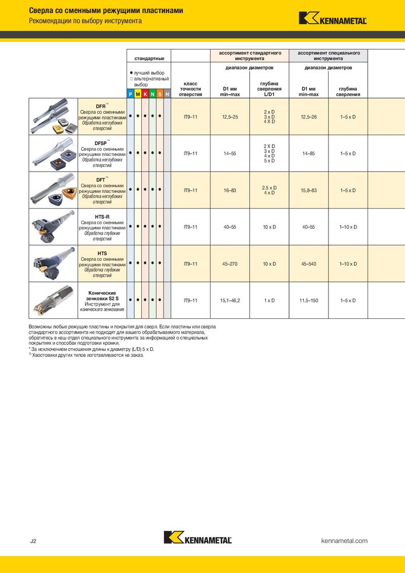 Сверла со сменными режущими пластинами Рекомендации по выбору инструмента ассортимент стандартного ассортимент специального стандартные инструмента инструмента диапазон диаметров диапазон диаметров ⅷ лучший выбор ࠗ альтернативный выбор класс глубина точности D1 мм сверления D1 мм глубина P M K N S H отверстия min–max L/D1 min–max сверления DFR™ Сверла со сменными ⅷ ⅷ ⅷ ⅷ ⅷ 2xD режущими пластинами IT9–11 12,5–25 3xD 12,5–26 1–5 x D Обработка неглубоких 4XD отверстий DFSP™ 2XD Сверла со сменными ⅷ ⅷ ⅷ ⅷ ⅷ 3xD режущими пластинами IT9–11 14–55 4xD 14–85 1–5 x D Обработка неглубоких 5xD отверстий DFT™ Сверла со сменными ⅷ ⅷ ⅷ ⅷ ⅷ 2.5 x D режущими пластинами IT9–11 16–83 4xD 15,8–83 1–5 x D Обработка неглубоких отверстий HTS-R Сверла со сменными ⅷ ⅷ ⅷ ⅷ ⅷ режущими пластинами IT9–11 40–55 10 x D 40–55 1–10 x D Обработка глубоких отверстий HTS Сверла со сменными ⅷ ⅷ ⅷ ⅷ ⅷ режущими пластинами IT9–11 45–270 10 x D 45–540 1–10 x D Обработка глубоких отверстий Конические зенковки S2 S ⅷ ⅷ ⅷ ⅷ ⅷ IT9–11 15,1–46,2 1xD 11,5–150 1–5 x D Инструмент для конического зенкования Возможны любые режущие пластины и покрытия для сверл. Если пластины или сверла стандартного ассортимента не подходят для вашего обрабатываемого материала, обратитесь в наш отдел специального инструмента за информацией о специальных покрытиях и способах подготовки кромки. * За исключением отношения длины к диаметру (L/D) 5 x D. 1) Хвостовики других типов изготавливаются на заказ. J2 kennametal.com