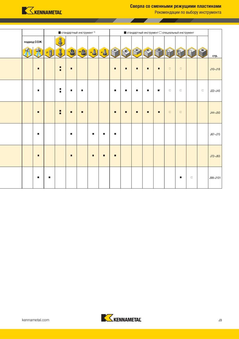 Сверла со сменными режущими пластинами Рекомендации по выбору инструмента Ⅵ стандартный инструмент 1) Ⅵ стандартный инструмент Ⅺ специальный инструмент подвод СОЖ стр. Ⅵ Ⅵ Ⅵ Ⅵ Ⅵ Ⅵ Ⅵ Ⅵ Ⅺ Ⅺ J10–J18 Ⅵ Ⅵ Ⅵ Ⅵ Ⅵ Ⅵ Ⅵ Ⅵ Ⅵ Ⅵ* Ⅺ Ⅺ Ⅺ J22–J40 Ⅵ Ⅵ Ⅵ Ⅵ Ⅵ Ⅵ Ⅵ Ⅵ Ⅵ Ⅵ Ⅺ Ⅺ J44–J50 Ⅵ Ⅵ Ⅵ Ⅵ Ⅵ Ⅵ J67–J70 Ⅵ Ⅵ Ⅵ Ⅵ Ⅵ J72–J83 Ⅵ Ⅵ Ⅵ Ⅺ J98–J101 kennametal.com J3