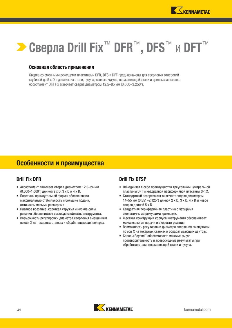 Сверла Drill Fix™ DFR™, DFS™ и DFT™ Основная область применения Сверла со сменными режущими пластинами DFR, DFS и DFT предназначены для сверления отверстий глубиной до 5 x D в деталях из стали, чугуна, ковкого чугуна, нержавеющей стали и цветных металлов. Ассортимент Drill Fix включает сверла диаметром 12,5–85 мм (0.500–3.250"). Особенности и преимущества Drill Fix DFR Drill Fix DFSP • Ассортимент включает сверла диаметром 12,5–24 мм • Объединяет в себе преимущества треугольной центральной (0.500–1,000") длиной 2 x D, 3 x D и 4 x D. пластины DFT и квадратной периферийной пластины SP..X. • Пластины прямоугольной формы обеспечивают • Стандартный ассортимент включает сверла диаметром максимальную стабильность и большие подачи, 14–55 мм (0.551–2.125") длиной 2 x D, 3 x D, 4 x D и новое отличаясь малыми размерами. сверло длиной 5 x D. • Плавное врезание, короткая стружка и низкие силы • Квадратная периферийная пластина с четырьмя резания обеспечивают высокую стойкость инструмента. экономичными режущими кромками. • Возможность регулировки диаметра сверления смещением • Жесткая конструкция корпуса инструмента обеспечивает по оси Х на токарных станках и обрабатывающих центрах. максимальные подачи и скорости резания. • Возможность регулировки диаметра сверления смещением по оси Х на токарных станках и обрабатывающих центрах. • Сплавы Beyond™ обеспечивают максимальную производительность и превосходные результаты при обработке стали, нержавеющей стали и чугуна. J4 kennametal.com