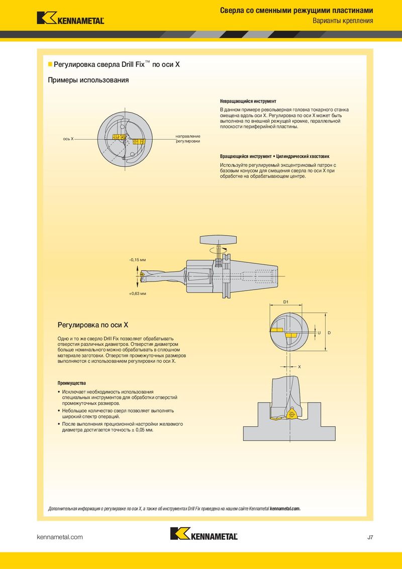 Сверла со сменными режущими пластинами Варианты крепления Регулировка сверла Drill Fix™ по оси Х Примеры использования Невращающийся инструмент В данном примере револьверная головка токарного станка смещена вдоль оси X. Регулировка по оси Х может быть выполнена по внешней режущей кромке, параллельной плоскости периферийной пластины. ось Х направление регулировки Вращающийся инструмент • Цилиндрический хвостовик Используйте регулируемый эксцентриковый патрон с базовым конусом для смещения сверла по оси Х при обработке на обрабатывающем центре. -0,15 мм +0,63 мм D1 Регулировка по оси Х U D Одно и то же сверло Drill Fix позволяет обрабатывать отверстия различных диаметров. Отверстия диаметром больше номинального можно обрабатывать в сплошном материале заготовки. Отверстия промежуточных размеров выполняются с использованием регулировки по оси Х. X Преимущества • Исключает необходимость использования специальных инструментов для обработки отверстий промежуточных размеров. • Небольшое количество сверл позволяет выполнять широкий спектр операций. • После выполнения прецизионной настройки желаемого диаметра достигается точность ± 0,05 мм. Дополнительная информация о регулировке по оси Х, а также об инструментах Drill Fix приведена на нашем сайте Kennametal kennametal.com. kennametal.com J7