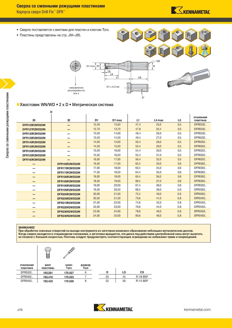 Сверла со сменными режущими пластинами Корпуса сверл Drill Fix™ DFR™ • Сверло поставляется с винтами для пластин и ключом Torx. • Пластины представлены на стр. J84–J85. D1 max направление D1 ± 0,2 мм регулировки по Сверла со сменными режущими пластинами оси x Хвостовик WN/WD • 2 x D • Метрическая система D эталонная 20 32 D1 D1 max L1 L4 max L5 пластина DFR125R2WD20M — 12,50 13,50 47,4 25,0 0,5 DFR0202.. DFR127R2WD20M — 12,70 13,70 47,8 25,4 0,5 DFR0202.. DFR130R2WD20M — 13,00 14,00 48,4 26,0 0,5 DFR0202.. DFR135R2WD20M — 13,50 14,50 49,4 27,0 0,5 DFR0202.. DFR140R2WD20M — 14,00 15,00 50,4 28,0 0,5 DFR0202.. DFR145R2WD20M — 14,50 15,50 53,4 29,0 0,5 DFR0202.. DFR150R2WD20M — 15,00 16,00 54,4 30,0 0,5 DFR0202.. DFR155R2WD20M — 15,50 16,50 55,4 31,0 0,5 DFR0202.. DFR160R2WD20M — 16,00 17,00 56,4 32,0 0,5 DFR0202.. — DFR165R2WD32M 16,50 17,50 62,4 33,0 0,6 DFR0302.. — DFR170R2WD32M 17,00 18,00 63,4 34,0 0,6 DFR0302.. — DFR175R2WD32M 17,50 18,50 64,4 35,0 0,6 DFR0302.. — DFR180R2WD32M 18,00 19,00 65,4 36,0 0,6 DFR0302.. — DFR185R2WD32M 18,50 19,50 66,4 37,0 0,6 DFR0302.. — DFR190R2WD32M 19,00 20,00 67,4 38,0 0,6 DFR0302.. — DFR195R2WD32M 19,50 20,50 68,4 39,0 0,6 DFR0302.. — DFR200R2WD32M 20,00 21,00 72,4 40,0 0,6 DFR0302.. — DFR205R2WD32M 20,50 21,50 73,6 41,0 0,8 DFR0403.. — DFR210R2WD32M 21,00 22,00 74,6 42,0 0,8 DFR0403.. — DFR220R2WD32M 22,00 23,00 76,6 44,0 0,8 DFR0403.. — DFR230R2WD32M 23,00 24,00 78,6 46,0 0,8 DFR0403.. — DFR240R2WD32M 24,00 25,00 80,6 48,0 0,8 DFR0403.. ВНИМАНИЕ! При обработке сквозных отверстий на выходе инструмента из заготовки возможно образование небольших металлических дисков. Когда сверло находится в стационарном положении, а заготовка вращается, эти диски под действием центробежной силы могут вылететь из патрона с большой скоростью. Поэтому следует предусмотреть соответствующее ограждение во избежание травм и повреждений. эталонная винт ключ размер пластина пластины Torx Torx DFR0202.. 193.281 170.027 6 D LS CS DFR0302.. 192.416 170.023 7 20 45 R 1/8 BSP DFR0403.. 192.432 170.028 8 32 58 R 1/4 BSP J10 kennametal.com