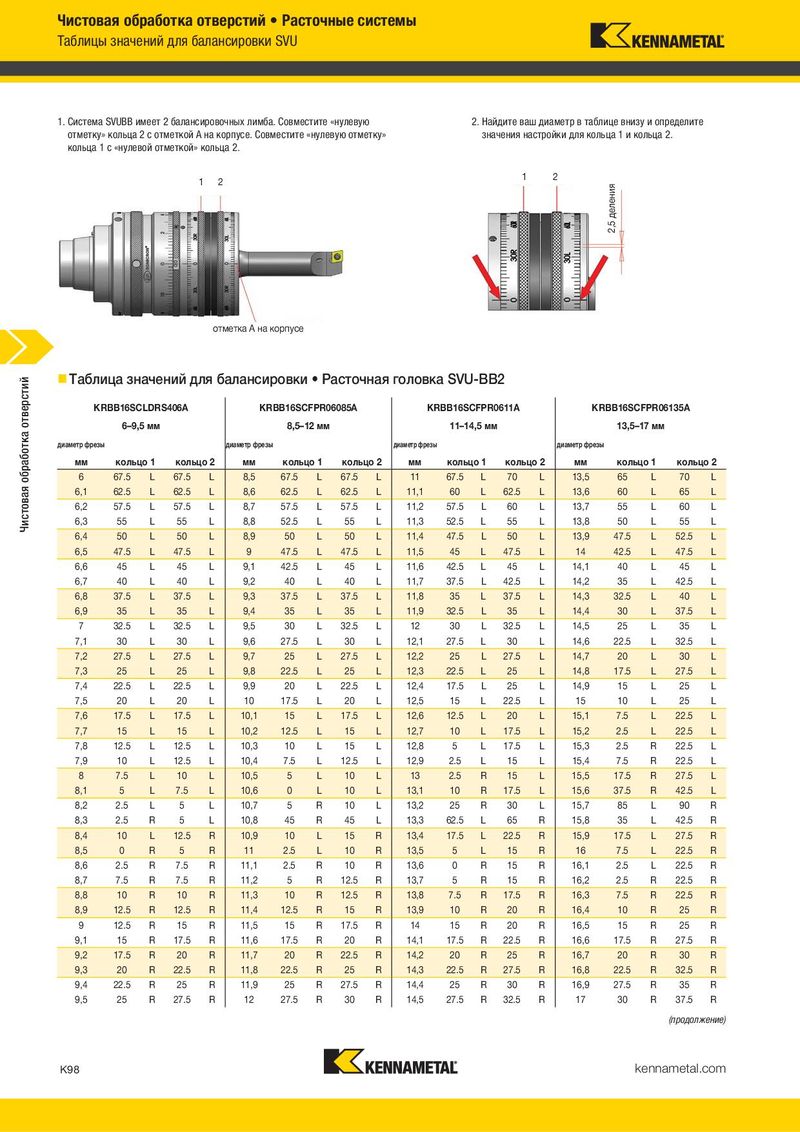 Чистовая обработка отверстий • Расточные системы Таблицы значений для балансировки SVU 1. Система SVUBB имеет 2 балансировочных лимба. Совместите «нулевую 2. Найдите ваш диаметр в таблице внизу и определите отметку» кольца 2 с отметкой A на корпусе. Совместите «нулевую отметку» значения настройки для кольца 1 и кольца 2. кольца 1 с «нулевой отметкой» кольца 2. 1 2 1 2 2,5 деления отметка A на корпусе Чистовая обработка отверстий Таблица значений для балансировки • Расточная головка SVU-BB2 KRBB16SCLDRS406A KRBB16SCFPR06085A KRBB16SCFPR0611A KRBB16SCFPR06135A 6–9,5 мм 8,5–12 мм 11–14,5 мм 13,5–17 мм диаметр фрезы диаметр фрезы диаметр фрезы диаметр фрезы мм кольцо 1 кольцо 2 мм кольцо 1 кольцо 2 мм кольцо 1 кольцо 2 мм кольцо 1 кольцо 2 6 67.5 L 67.5 L 8,5 67.5 L 67.5 L 11 67.5 L 70 L 13,5 65 L 70 L 6,1 62.5 L 62.5 L 8,6 62.5 L 62.5 L 11,1 60 L 62.5 L 13,6 60 L 65 L 6,2 57.5 L 57.5 L 8,7 57.5 L 57.5 L 11,2 57.5 L 60 L 13,7 55 L 60 L 6,3 55 L 55 L 8,8 52.5 L 55 L 11,3 52.5 L 55 L 13,8 50 L 55 L 6,4 50 L 50 L 8,9 50 L 50 L 11,4 47.5 L 50 L 13,9 47.5 L 52.5 L 6,5 47.5 L 47.5 L 9 47.5 L 47.5 L 11,5 45 L 47.5 L 14 42.5 L 47.5 L 6,6 45 L 45 L 9,1 42.5 L 45 L 11,6 42.5 L 45 L 14,1 40 L 45 L 6,7 40 L 40 L 9,2 40 L 40 L 11,7 37.5 L 42.5 L 14,2 35 L 42.5 L 6,8 37.5 L 37.5 L 9,3 37.5 L 37.5 L 11,8 35 L 37.5 L 14,3 32.5 L 40 L 6,9 35 L 35 L 9,4 35 L 35 L 11,9 32.5 L 35 L 14,4 30 L 37.5 L 7 32.5 L 32.5 L 9,5 30 L 32.5 L 12 30 L 32.5 L 14,5 25 L 35 L 7,1 30 L 30 L 9,6 27.5 L 30 L 12,1 27.5 L 30 L 14,6 22.5 L 32.5 L 7,2 27.5 L 27.5 L 9,7 25 L 27.5 L 12,2 25 L 27.5 L 14,7 20 L 30 L 7,3 25 L 25 L 9,8 22.5 L 25 L 12,3 22.5 L 25 L 14,8 17.5 L 27.5 L 7,4 22.5 L 22.5 L 9,9 20 L 22.5 L 12,4 17.5 L 25 L 14,9 15 L 25 L 7,5 20 L 20 L 10 17.5 L 20 L 12,5 15 L 22.5 L 15 10 L 25 L 7,6 17.5 L 17.5 L 10,1 15 L 17.5 L 12,6 12.5 L 20 L 15,1 7.5 L 22.5 L 7,7 15 L 15 L 10,2 12.5 L 15 L 12,7 10 L 17.5 L 15,2 2.5 L 22.5 L 7,8 12.5 L 12.5 L 10,3 10 L 15 L 12,8 5 L 17.5 L 15,3 2.5 R 22.5 L 7,9 10 L 12.5 L 10,4 7.5 L 12.5 L 12,9 2.5 L 15 L 15,4 7.5 R 22.5 L 8 7.5 L 10 L 10,5 5 L 10 L 13 2.5 R 15 L 15,5 17.5 R 27.5 L 8,1 5 L 7.5 L 10,6 0 L 10 L 13,1 10 R 17.5 L 15,6 37.5 R 42.5 L 8,2 2.5 L 5 L 10,7 5 R 10 L 13,2 25 R 30 L 15,7 85 L 90 R 8,3 2.5 R 5 L 10,8 45 R 45 L 13,3 62.5 L 65 R 15,8 35 L 42.5 R 8,4 10 L 12.5 R 10,9 10 L 15 R 13,4 17.5 L 22.5 R 15,9 17.5 L 27.5 R 8,5 0 R 5 R 11 2.5 L 10 R 13,5 5 L 15 R 16 7.5 L 22.5 R 8,6 2.5 R 7.5 R 11,1 2.5 R 10 R 13,6 0 R 15 R 16,1 2.5 L 22.5 R 8,7 7.5 R 7.5 R 11,2 5 R 12.5 R 13,7 5 R 15 R 16,2 2.5 R 22.5 R 8,8 10 R 10 R 11,3 10 R 12.5 R 13,8 7.5 R 17.5 R 16,3 7.5 R 22.5 R 8,9 12.5 R 12.5 R 11,4 12.5 R 15 R 13,9 10 R 20 R 16,4 10 R 25 R 9 12.5 R 15 R 11,5 15 R 17.5 R 14 15 R 20 R 16,5 15 R 25 R 9,1 15 R 17.5 R 11,6 17.5 R 20 R 14,1 17.5 R 22.5 R 16,6 17.5 R 27.5 R 9,2 17.5 R 20 R 11,7 20 R 22.5 R 14,2 20 R 25 R 16,7 20 R 30 R 9,3 20 R 22.5 R 11,8 22.5 R 25 R 14,3 22.5 R 27.5 R 16,8 22.5 R 32.5 R 9,4 22.5 R 25 R 11,9 25 R 27.5 R 14,4 25 R 30 R 16,9 27.5 R 35 R 9,5 25 R 27.5 R 12 27.5 R 30 R 14,5 27.5 R 32.5 R 17 30 R 37.5 R (продолжение) K98 kennametal.com