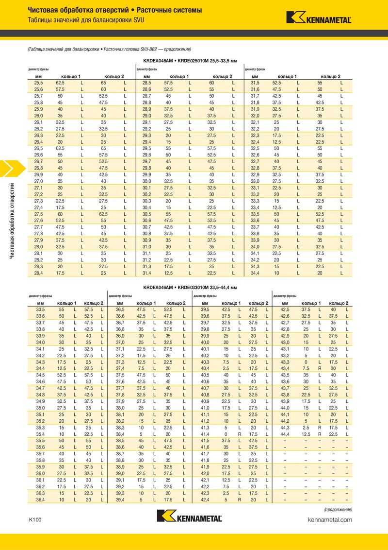 Чистовая обработка отверстий • Расточные системы Таблицы значений для балансировки SVU (Таблица значений для балансировки • Расточная головка SVU-BB2 — продолжение) KRDEA046AM • KRDE025010M 25,5–33,5 мм диаметр фрезы диаметр фрезы диаметр фрезы мм кольцо 1 кольцо 2 мм кольцо 1 кольцо 2 мм кольцо 1 кольцо 2 25,5 62.5 L 65 L 28,5 57.5 L 60 L 31,5 52.5 L 55 L 25,6 57.5 L 60 L 28,6 52.5 L 55 L 31,6 47.5 L 50 L 25,7 50 L 52.5 L 28,7 45 L 50 L 31,7 42.5 L 45 L 25,8 45 L 47.5 L 28,8 40 L 45 L 31,8 37.5 L 42.5 L 25,9 40 L 45 L 28,9 37.5 L 40 L 31,9 32.5 L 37.5 L 26,0 35 L 40 L 29,0 32.5 L 37.5 L 32,0 27.5 L 35 L 26,1 32.5 L 35 L 29,1 27.5 L 32.5 L 32,1 25 L 30 L 26,2 27.5 L 32.5 L 29,2 25 L 30 L 32,2 20 L 27.5 L 26,3 22.5 L 30 L 29,3 20 L 27.5 L 32,3 17.5 L 22.5 L 26,4 20 L 25 L 29,4 15 L 25 L 32,4 12.5 L 22.5 L 26,5 62.5 L 65 L 29,5 55 L 57.5 L 32,5 50 L 55 L 26,6 55 L 57.5 L 29,6 50 L 52.5 L 32,6 45 L 50 L 26,7 50 L 52.5 L 29,7 45 L 47.5 L 32,7 40 L 45 L 26,8 45 L 47.5 L 29,8 40 L 45 L 32,8 37.5 L 40 L 26,9 40 L 42.5 L 29,9 35 L 40 L 32,9 32.5 L 37.5 L Чистовая обработка отверстий 27,0 35 L 40 L 30,0 32.5 L 35 L 33,0 27.5 L 32.5 L 27,1 30 L 35 L 30,1 27.5 L 32.5 L 33,1 22.5 L 30 L 27,2 25 L 32.5 L 30,2 22.5 L 30 L 33,2 20 L 25 L 27,3 22.5 L 27.5 L 30,3 20 L 25 L 33,3 15 L 22.5 L 27,4 17.5 L 25 L 30,4 15 L 22.5 L 33,4 12.5 L 20 L 27,5 60 L 62.5 L 30,5 55 L 57.5 L 33,5 50 L 52.5 L 27,6 52.5 L 55 L 30,6 47.5 L 52.5 L 33,6 45 L 47.5 L 27,7 47.5 L 50 L 30,7 42.5 L 47.5 L 33,7 40 L 42.5 L 27,8 42.5 L 45 L 30,8 37.5 L 42.5 L 33,8 35 L 40 L 27,9 37.5 L 42.5 L 30,9 35 L 37.5 L 33,9 30 L 35 L 28,0 32.5 L 37.5 L 31,0 30 L 35 L 34,0 27.5 L 32.5 L 28,1 30 L 35 L 31,1 25 L 32.5 L 34,1 22.5 L 27.5 L 28,2 25 L 30 L 31,2 22.5 L 27.5 L 34,2 20 L 25 L 28,3 20 L 27.5 L 31,3 17.5 L 25 L 34,3 15 L 22.5 L 28,4 17.5 L 25 L 31,4 12.5 L 22.5 L 34,4 10 L 20 L KRDEA046AM • KRDE033010M 33,5–44,4 мм диаметр фрезы диаметр фрезы диаметр фрезы диаметр фрезы мм кольцо 1 кольцо 2 мм кольцо 1 кольцо 2 мм кольцо 1 кольцо 2 мм кольцо 1 кольцо 2 33,5 55 L 57.5 L 36,5 47.5 L 52.5 L 39,5 42.5 L 47.5 L 42,5 37.5 L 40 L 33,6 50 L 52.5 L 36,6 42.5 L 47.5 L 39,6 37.5 L 42.5 L 42,6 32.5 L 37.5 L 33,7 45 L 47.5 L 36,7 37.5 L 42.5 L 39,7 32.5 L 37.5 L 42,7 27.5 L 35 L 33,8 40 L 42.5 L 36,8 35 L 37.5 L 39,8 27.5 L 35 L 42,8 25 L 30 L 33,9 35 L 40 L 36,9 30 L 35 L 39,9 25 L 30 L 42,9 20 L 27.5 L 34,0 30 L 35 L 37,0 25 L 32.5 L 40,0 20 L 27.5 L 43,0 15 L 25 L 34,1 25 L 32.5 L 37,1 22.5 L 27.5 L 40,1 15 L 25 L 43,1 10 L 22.5 L 34,2 22.5 L 27.5 L 37,2 17.5 L 25 L 40,2 10 L 22.5 L 43,2 5 L 20 L 34,3 17.5 L 25 L 37,3 12.5 L 22.5 L 40,3 7.5 L 20 L 43,3 0 L 17.5 L 34,4 12.5 L 22.5 L 37,4 7.5 L 20 L 40,4 2.5 L 17.5 L 43,4 7.5 R 20 L 34,5 52.5 L 57.5 L 37,5 47.5 L 50 L 40,5 40 L 45 L 43,5 35 L 40 L 34,6 47.5 L 50 L 37,6 42.5 L 45 L 40,6 35 L 40 L 43,6 30 L 35 L 34,7 42.5 L 47.5 L 37,7 37.5 L 40 L 40,7 30 L 37.5 L 43,7 25 L 32.5 L 34,8 37.5 L 42.5 L 37,8 32.5 L 37.5 L 40,8 27.5 L 32.5 L 43,8 22.5 L 27.5 L 34,9 32.5 L 37.5 L 37,9 27.5 L 35 L 40,9 22.5 L 30 L 43,9 17.5 L 25 L 35,0 27.5 L 35 L 38,0 25 L 30 L 41,0 17.5 L 27.5 L 44,0 15 L 22.5 L 35,1 25 L 30 L 38,1 20 L 27.5 L 41,1 15 L 22.5 L 44,1 10 L 20 L 35,2 20 L 27.5 L 38,2 15 L 25 L 41,2 10 L 20 L 44,2 5 L 17.5 L 35,3 15 L 25 L 38,3 10 L 22.5 L 41,3 5 L 20 L 44,3 2.5 R 17.5 L 35,4 10 L 22.5 L 38,4 5 L 20 L 41,4 0 R 17.5 L 44,4 12.5 R 22.5 L 35,5 50 L 55 L 38,5 45 L 47.5 L 41,5 37.5 L 42.5 L – – – – – 35,6 45 L 50 L 38,6 40 L 42.5 L 41,6 35 L 37.5 L – – – – – 35,7 40 L 45 L 38,7 35 L 40 L 41,7 30 L 35 L – – – – – 35,8 35 L 40 L 38,8 30 L 35 L 41,8 25 L 32.5 L – – – – – 35,9 30 L 37.5 L 38,9 25 L 32.5 L 41,9 22.5 L 27.5 L – – – – – 36,0 27.5 L 32.5 L 39,0 22.5 L 27.5 L 42,0 17.5 L 25 L – – – – – 36,1 22.5 L 30 L 39,1 17.5 L 25 L 42,1 12.5 L 22.5 L – – – – – 36,2 17.5 L 27.5 L 39,2 15 L 22.5 L 42,2 7.5 L 20 L – – – – – 36,3 15 L 22.5 L 39,3 10 L 20 L 42,3 2.5 L 17.5 L – – – – – 36,4 10 L 20 L 39,4 5 L 17.5 L 42,4 5 R 20 L – – – – – (продолжение) K100 kennametal.com