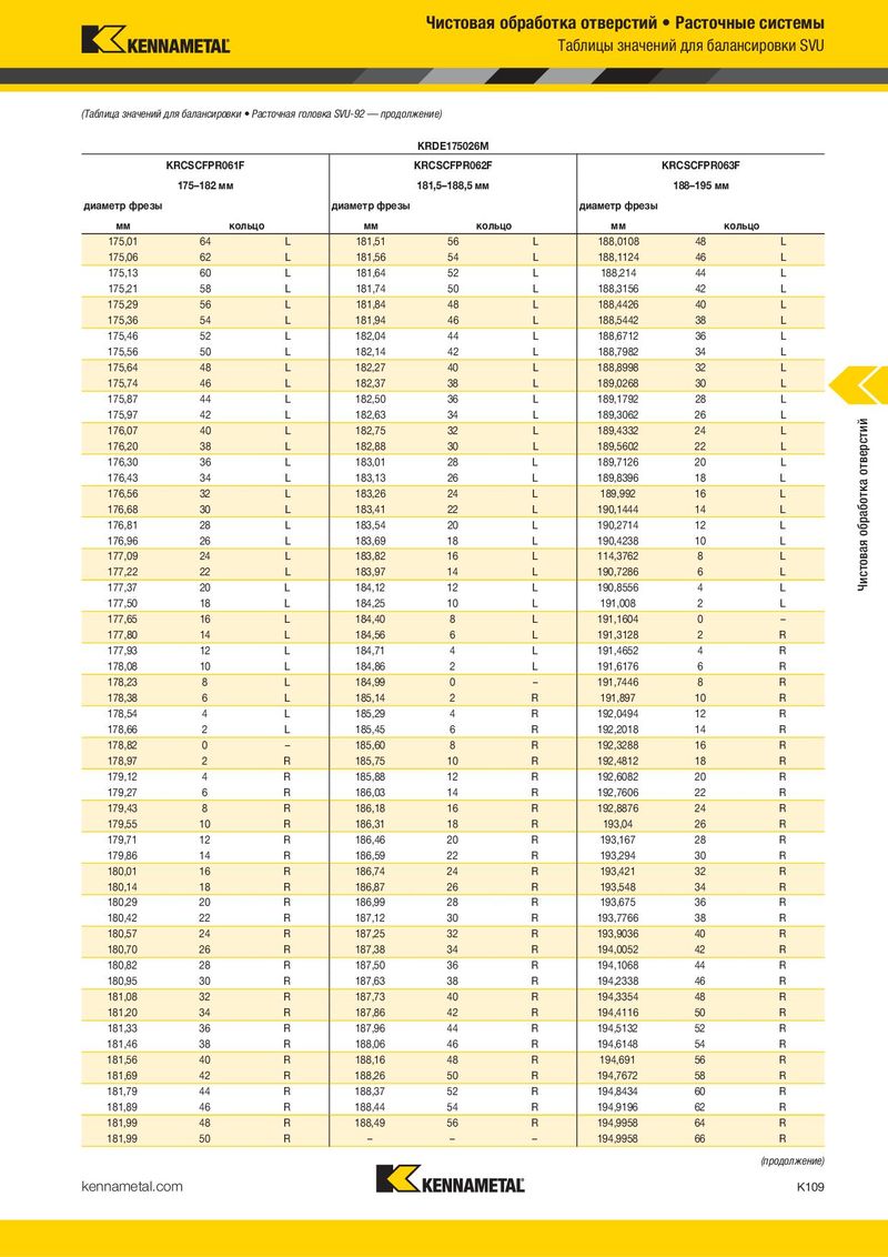 Чистовая обработка отверстий • Расточные системы Таблицы значений для балансировки SVU (Таблица значений для балансировки • Расточная головка SVU-92 — продолжение) KRDE175026M KRCSCFPR061F KRCSCFPR062F KRCSCFPR063F 175–182 мм 181,5–188,5 мм 188–195 мм диаметр фрезы диаметр фрезы диаметр фрезы мм кольцо мм кольцо мм кольцо 175,01 64 L 181,51 56 L 188,0108 48 L 175,06 62 L 181,56 54 L 188,1124 46 L 175,13 60 L 181,64 52 L 188,214 44 L 175,21 58 L 181,74 50 L 188,3156 42 L 175,29 56 L 181,84 48 L 188,4426 40 L 175,36 54 L 181,94 46 L 188,5442 38 L 175,46 52 L 182,04 44 L 188,6712 36 L 175,56 50 L 182,14 42 L 188,7982 34 L 175,64 48 L 182,27 40 L 188,8998 32 L 175,74 46 L 182,37 38 L 189,0268 30 L 175,87 44 L 182,50 36 L 189,1792 28 L 175,97 42 L 182,63 34 L 189,3062 26 L Чистовая обработка отверстий 176,07 40 L 182,75 32 L 189,4332 24 L 176,20 38 L 182,88 30 L 189,5602 22 L 176,30 36 L 183,01 28 L 189,7126 20 L 176,43 34 L 183,13 26 L 189,8396 18 L 176,56 32 L 183,26 24 L 189,992 16 L 176,68 30 L 183,41 22 L 190,1444 14 L 176,81 28 L 183,54 20 L 190,2714 12 L 176,96 26 L 183,69 18 L 190,4238 10 L 177,09 24 L 183,82 16 L 114,3762 8 L 177,22 22 L 183,97 14 L 190,7286 6 L 177,37 20 L 184,12 12 L 190,8556 4 L 177,50 18 L 184,25 10 L 191,008 2 L 177,65 16 L 184,40 8 L 191,1604 0 – 177,80 14 L 184,56 6 L 191,3128 2 R 177,93 12 L 184,71 4 L 191,4652 4 R 178,08 10 L 184,86 2 L 191,6176 6 R 178,23 8 L 184,99 0 – 191,7446 8 R 178,38 6 L 185,14 2 R 191,897 10 R 178,54 4 L 185,29 4 R 192,0494 12 R 178,66 2 L 185,45 6 R 192,2018 14 R 178,82 0 – 185,60 8 R 192,3288 16 R 178,97 2 R 185,75 10 R 192,4812 18 R 179,12 4 R 185,88 12 R 192,6082 20 R 179,27 6 R 186,03 14 R 192,7606 22 R 179,43 8 R 186,18 16 R 192,8876 24 R 179,55 10 R 186,31 18 R 193,04 26 R 179,71 12 R 186,46 20 R 193,167 28 R 179,86 14 R 186,59 22 R 193,294 30 R 180,01 16 R 186,74 24 R 193,421 32 R 180,14 18 R 186,87 26 R 193,548 34 R 180,29 20 R 186,99 28 R 193,675 36 R 180,42 22 R 187,12 30 R 193,7766 38 R 180,57 24 R 187,25 32 R 193,9036 40 R 180,70 26 R 187,38 34 R 194,0052 42 R 180,82 28 R 187,50 36 R 194,1068 44 R 180,95 30 R 187,63 38 R 194,2338 46 R 181,08 32 R 187,73 40 R 194,3354 48 R 181,20 34 R 187,86 42 R 194,4116 50 R 181,33 36 R 187,96 44 R 194,5132 52 R 181,46 38 R 188,06 46 R 194,6148 54 R 181,56 40 R 188,16 48 R 194,691 56 R 181,69 42 R 188,26 50 R 194,7672 58 R 181,79 44 R 188,37 52 R 194,8434 60 R 181,89 46 R 188,44 54 R 194,9196 62 R 181,99 48 R 188,49 56 R 194,9958 64 R 181,99 50 R – – – 194,9958 66 R (продолжение) kennametal.com K109