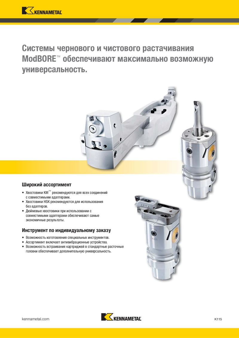 Системы чернового и чистового растачивания ModBORE™ обеспечивают максимально возможную универсальность. Широкий ассортимент • Хвостовики KM™ рекомендуются для всех соединений с совместимыми адаптерами. • Хвостовики HSK рекомендуются для использования без адаптеров. • Дюймовые хвостовики при использовании с совместимыми адаптерами обеспечивают самые экономичные результаты. Инструмент по индивидуальному заказу • Возможность изготовления специальных инструментов. • Ассортимент включает антивибрационные устройства. • Возможность встраивания картриджей в стандартные расточные головки обеспечивает дополнительную универсальность. kennametal.com K115