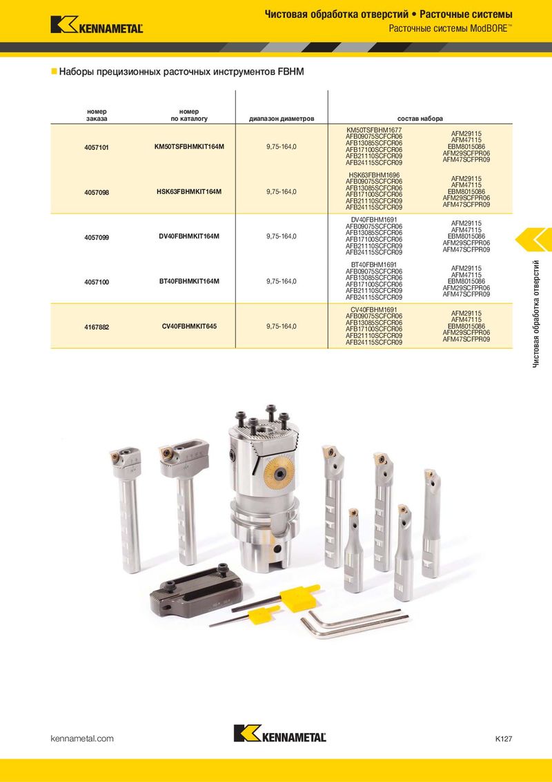 Чистовая обработка отверстий • Расточные системы Расточные системы ModBORE™ Наборы прецизионных расточных инструментов FBHM номер номер заказа по каталогу диапазон диаметров состав набора KM50TSFBHM1677 AFM29115 AFB09075SCFCR06 AFM47115 4057101 KM50TSFBHMKIT164M 9,75-164,0 AFB13085SCFCR06 EBM8015086 AFB17100SCFCR06 AFM29SCFPR06 AFB21110SCFCR09 AFM47SCFPR09 AFB24115SCFCR09 HSK63FBHM1696 AFM29115 AFB09075SCFCR06 AFM47115 4057098 HSK63FBHMKIT164M 9,75-164,0 AFB13085SCFCR06 EBM8015086 AFB17100SCFCR06 AFM29SCFPR06 AFB21110SCFCR09 AFM47SCFPR09 AFB24115SCFCR09 DV40FBHM1691 AFM29115 AFB09075SCFCR06 AFM47115 4057099 DV40FBHMKIT164M 9,75-164,0 AFB13085SCFCR06 EBM8015086 AFB17100SCFCR06 AFM29SCFPR06 AFB21110SCFCR09 AFM47SCFPR09 AFB24115SCFCR09 BT40FBHM1691 AFM29115 Чистовая обработка отверстий AFB09075SCFCR06 AFM47115 4057100 BT40FBHMKIT164M 9,75-164,0 AFB13085SCFCR06 EBM8015086 AFB17100SCFCR06 AFM29SCFPR06 AFB21110SCFCR09 AFM47SCFPR09 AFB24115SCFCR09 CV40FBHM1691 AFM29115 AFB09075SCFCR06 AFM47115 4167882 CV40FBHMKIT645 9,75-164,0 AFB13085SCFCR06 EBM8015086 AFB17100SCFCR06 AFM29SCFPR06 AFB21110SCFCR09 AFM47SCFPR09 AFB24115SCFCR09 kennametal.com K127