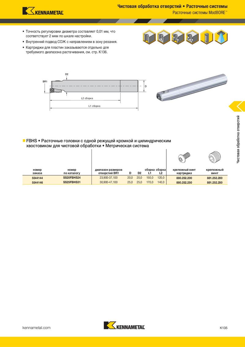 Чистовая обработка отверстий • Расточные системы Расточные системы ModBORE™ • Точность регулировки диаметра составляет 0,01 мм, что соответствует 2 мкм по шкале настройки. • Внутренний подвод СОЖ с направлением в зону резания. • Картриджи для пластин заказываются отдельно для требуемого диапазона растачивания, см. стр. K136. L2 сборка L1 сборка FBHS • Расточные головки с одной режущей кромкой и цилиндрическим Чистовая обработка отверстий хвостовиком для чистовой обработки • Метрическая система номер номер диапазон размеров сборка сборка крепежный винт крепежный заказа по каталогу отверстий BR1 D D2 L1 L2 картриджа винт 5544144 SS20FBHS24 23,900-37,100 20,0 20,0 150,0 120,0 880.252.200 881.252.200 5544146 SS25FBHS31 30,900-47,100 25,0 25,0 170,0 140,0 880.252.250 881.252.250 kennametal.com K135