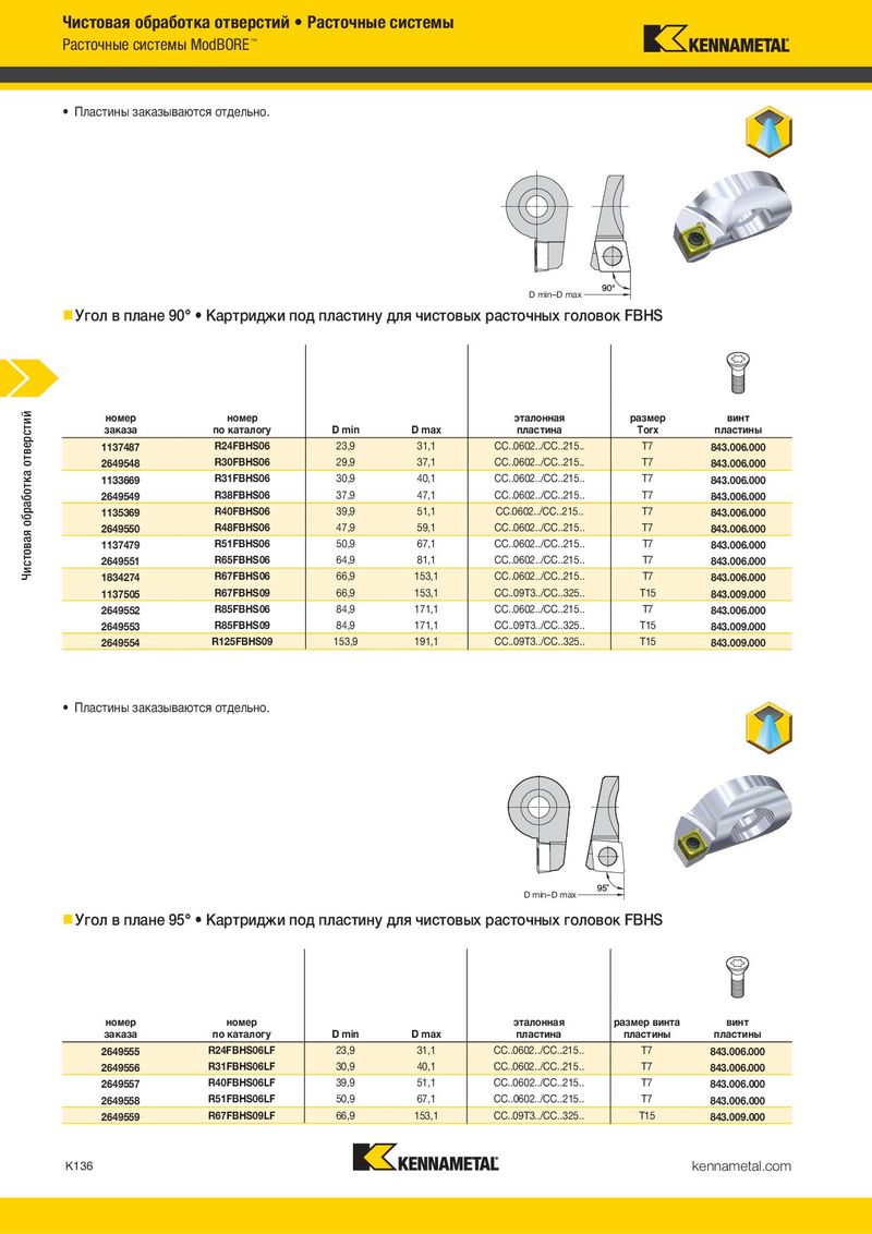 Чистовая обработка отверстий • Расточные системы Расточные системы ModBORE™ • Пластины заказываются отдельно. D min–D max Угол в плане 90° • Картриджи под пластину для чистовых расточных головок FBHS Чистовая обработка отверстий номер номер эталонная размер винт заказа по каталогу D min D max пластина Torx пластины 1137487 R24FBHS06 23,9 31,1 CC..0602../CC..215.. T7 843.006.000 2649548 R30FBHS06 29,9 37,1 CC..0602../CC..215.. T7 843.006.000 1133669 R31FBHS06 30,9 40,1 CC..0602../CC..215.. T7 843.006.000 2649549 R38FBHS06 37,9 47,1 CC..0602../CC..215.. T7 843.006.000 1135369 R40FBHS06 39,9 51,1 CC.0602../CC..215.. T7 843.006.000 2649550 R48FBHS06 47,9 59,1 CC..0602../CC..215.. T7 843.006.000 1137479 R51FBHS06 50,9 67,1 CC..0602../CC..215.. T7 843.006.000 2649551 R65FBHS06 64,9 81,1 CC..0602../CC..215.. T7 843.006.000 1834274 R67FBHS06 66,9 153,1 CC..0602../CC..215.. T7 843.006.000 1137505 R67FBHS09 66,9 153,1 CC..09T3../CC..325.. T15 843.009.000 2649552 R85FBHS06 84,9 171,1 CC..0602../CC..215.. T7 843.006.000 2649553 R85FBHS09 84,9 171,1 CC..09T3../CC..325.. T15 843.009.000 2649554 R125FBHS09 153,9 191,1 CC..09T3../CC..325.. T15 843.009.000 • Пластины заказываются отдельно. D min–D max Угол в плане 95° • Картриджи под пластину для чистовых расточных головок FBHS номер номер эталонная размер винта винт заказа по каталогу D min D max пластина пластины пластины 2649555 R24FBHS06LF 23,9 31,1 CC..0602../CC..215.. T7 843.006.000 2649556 R31FBHS06LF 30,9 40,1 CC..0602../CC..215.. T7 843.006.000 2649557 R40FBHS06LF 39,9 51,1 CC..0602../CC..215.. T7 843.006.000 2649558 R51FBHS06LF 50,9 67,1 CC..0602../CC..215.. T7 843.006.000 2649559 R67FBHS09LF 66,9 153,1 CC..09T3../CC..325.. T15 843.009.000 K136 kennametal.com