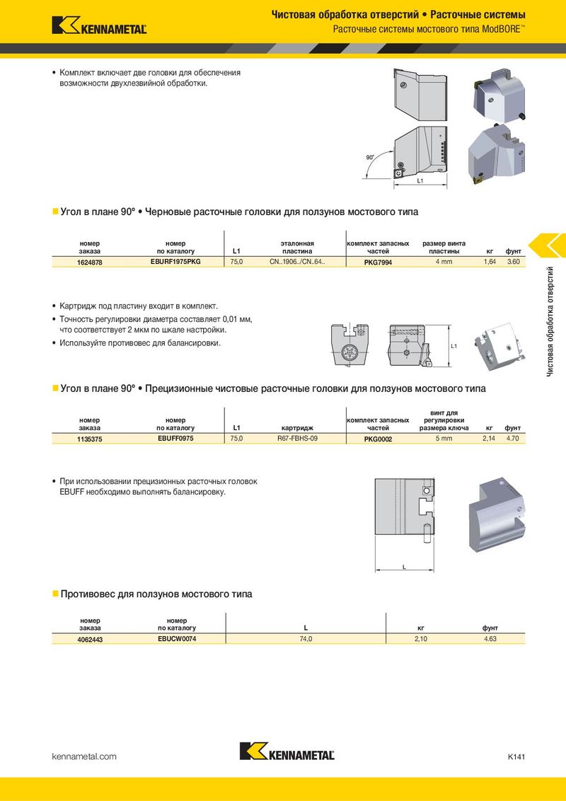 Чистовая обработка отверстий • Расточные системы Расточные системы мостового типа ModBORE™ • Комплект включает две головки для обеспечения возможности двухлезвийной обработки. Угол в плане 90° • Черновые расточные головки для ползунов мостового типа номер номер эталонная комплект запасных размер винта заказа по каталогу L1 пластина частей пластины кг фунт 1624878 EBURF1975PKG 75,0 CN..1906../CN..64.. PKG7994 4 mm 1,64 3.60 • Картридж под пластину входит в комплект. Чистовая обработка отверстий • Точность регулировки диаметра составляет 0,01 мм, что соответствует 2 мкм по шкале настройки. • Используйте противовес для балансировки. L1 Угол в плане 90° • Прецизионные чистовые расточные головки для ползунов мостового типа винт для номер номер комплект запасных регулировки заказа по каталогу L1 картридж частей размера ключа кг фунт 1135375 EBUFF0975 75,0 R67-FBHS-09 PKG0002 5 mm 2,14 4.70 • При использовании прецизионных расточных головок EBUFF необходимо выполнять балансировку. Противовес для ползунов мостового типа номер номер заказа по каталогу L кг фунт 4062443 EBUCW0074 74,0 2,10 4.63 kennametal.com K141