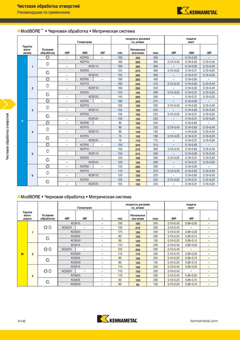 Чистовая обработка отверстий Рекомендации по применению ModBORE™ • Черновая обработка • Метрическая система скорость резания подача Геометрия vc, м/мин мм/r Группа мате- Условия Начальное риала обработки -MP -MN -MF min значение max -MP -MN -MF – KCP05 – 180 435 495 – 0,16–0,63 – KCP10 180 395 360 0,10–0,40 0,16–0,63 0,10–0,40 1 – KC9110 180 395 360 – 0,16–0,63 0,10–0,40 KCP25 125 275 360 0,10–0,20 0,16–0,31 0,10–0,20 – KC9125 155 280 360 – 0,16–0,31 0,10–0,20 – KCP05 – 180 265 400 – 0,16–0,63 – KCP10 180 240 470 0,10–0,40 0,16–0,63 0,10–0,40 2 – KC9110 180 250 340 – 0,16–0,63 0,10–0,40 KCP25 125 195 280 0,10–0,20 0,16–0,31 0,10–0,20 – KC9125 140 200 295 – 0,16–0,31 0,10–0,20 – KCP05 – 180 205 275 – 0,16–0,63 – KCP10 160 190 350 0,10–0,40 0,16–0,63 0,10–0,40 3 – KC9110 155 190 235 – 0,16–0,63 0,10–0,40 Чистовая обработка отверстий KCP25 135 155 225 0,10–0,20 0,16–0,31 0,10–0,20 P – KC9125 135 155 225 – 0,16–0,31 0,10–0,20 – KCP05 – 90 160 220 – 0,16–0,63 – KCP10 90 145 235 0,10–0,40 0,16–0,63 0,10–0,40 4 – KC9110 90 145 195 – 0,16–0,63 0,10–0,40 KCP25 75 105 180 0,10–0,20 0,16–0,31 0,10–0,20 – KC9125 75 110 175 – 0,16–0,31 0,10–0,20 – KCP05 – 150 240 315 – 0,16–0,63 – KCP10 150 215 300 0,10–0,40 0,16–0,63 0,10–0,40 5 – KC9110 150 215 300 – 0,16–0,63 0,10–0,40 KCP25 120 195 260 0,10–0,20 0,16–0,31 0,10–0,20 – KC9125 120 195 260 – 0,16–0,31 0,10–0,20 – KCP05 – 140 200 300 – 0,16–0,63 – KCP10 110 180 270 0,10–0,40 0,16–0,63 0,10–0,40 6 – KC9110 120 180 225 – 0,16–0,63 0,10–0,40 KCP25 105 150 225 0,10–0,20 0,16–0,31 0,10–0,20 – KC9125 105 150 225 – 0,16–0,31 0,10–0,20 ModBORE • Черновая обработка • Метрическая система скорость резания подача Геометрия vc, м/мин мм/r Группа мате- Условия Начальное риала обработки -MP -MF – min значение max -MP -MF – KCM15 – 100 180 240 0,10–0,40 0,08–0,30 – KC5010 – – 130 215 250 0,10–0,40 – – 1 KC9225 – 175 185 250 0,10–0,40 0,08–0,30 – KCM25 – 90 150 200 0,10–0,20 0,08–0,15 – KC9240 – 90 120 135 0,10–0,20 0,08–0,15 – KCM15 – 110 165 250 0,10–0,40 0,08–0,30 – KC5010 – – 125 200 250 0,10–0,40 – – M 2 KC9225 – 110 170 230 0,10–0,40 0,08–0,30 – KCM25 – 90 150 225 0,10–0,20 0,08–0,15 – KC9240 – 80 105 135 0,10–0,20 0,08–0,15 – KCM15 – 110 150 250 0,10–0,40 0,08–0,30 – KC5010 – – 110 150 230 0,10–0,40 – – 3 KC9225 – 110 150 230 0,10–0,40 0,08–0,30 – KCM25 – 90 120 200 0,10–0,20 0,08–0,15 – KC9240 – 80 90 135 0,10–0,20 0,08–0,15 – K142 kennametal.com
