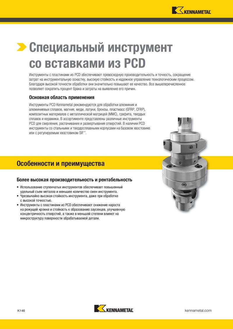 Специальный инструмент со вставками из PCD Инструменты с пластинами из PCD обеспечивают превосходную производительность и точность, сокращение затрат на инструментальную оснастку, высокую стойкость и надежное управление технологическим процессом. Благодаря высокой точности обработки они значительно повышают ее качество. Все вышеперечисленное позволяет сократить процент брака и затраты на выявление его причин. Основная область применения Инструменты PCD Kennametal рекомендуются для обработки алюминия и алюминиевых сплавов, магния, меди, латуни, бронзы, пластмасс (GFRP, CFRP), композитных материалов с металлической матрицей (MMC), графита, твердых сплавов и керамики. В ассортименте представлены различные инструменты PCD для сверления, растачивания и развертывания отверстий. В наличии PCD инструменты со стальными и твердосплавными корпусами на базовом хвостовике или с регулируемым хвостовиком SIF™. Особенности и преимущества Более высокая производительность и рентабельность • Использование ступенчатых инструментов обеспечивает повышенный удельный съем металла и меньшее количество смен инструмента. • Чрезвычайно высокая стойкость инструмента, даже при обработке с высокой точностью. • Инструменты с пластинами из PCD обеспечивают снижение нароста на режущей кромке и стойкость к образованию заусенцев, улучшенную концентричность отверстий, а также в меньшей степени влияют на микроструктуру поверхности обрабатываемой детали. K146 kennametal.com