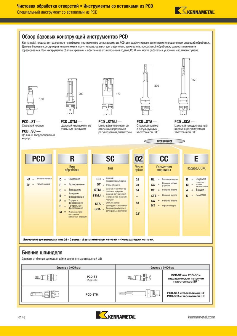 Чистовая обработка отверстий • Инструменты со вставками из PCD Специальный инструмент со вставками из PCD Обзор базовых конструкций инструментов PCD Kennametal предлагает различные платформы инструментов со вставками из PCD для эффективного выполнения определенных операций обработки. Данные базовые конструкции независимы и могут использоваться для сверления, зенкования, профильной обработки, развертывания или фрезерования. Все инструменты сбалансированы и обеспечивают внутренний подвод СОЖ или могут работать в условиях масляного тумана. 350 300 200 170 150 PCD ..ST — PCD ..STM — PCD ..STMJ — PCD ..STA — PCD ..SCA — Стальной корпус Цельный инструмент со Цельный инструмент со Стальной корпус Цельный твердосплавный PCD ..SC — стальным корпусом стальным корпусом и с регулируемым корпус с регулируемым регулируемым диаметром хвостовиком SIF™ хвостовиком SIF Цельный твердосплавный корпус PCDRSC02CCE PCD R SC 02 CC E Вид Тип Число Геометрия Подвод СОЖ вершины обработки зубьев HF = Винтовая канавка D = Сверление SC = Цельный 02 RL = Головка развертки E = Эмульсия твердосплавный корпус Обработка в SF = Прямая канавка R = Развертывание ST = Стальной корпус 03 CC = Режущая кромка M = условиях у центра масляного тумана C = Зенкование STM = Цельный инструмент со 04 CT = Вершина сверла A = Воздух Концевое стальным корпусом E = STMJ = Цельный регулируемый ... CTE = Вершина сверла D = Без СОЖ фрезерование инструмент со стальным F = Торцевое корпусом SW = Вершина сверла фрезерование STA = Стальной корпус с 12 P = Профильное регулируемым хвостовиком MT = Вершина сверла фрезерование SCA = Твердосплавный корпус с ... M = Инструмент для регулируемым хвостовиком выполнения 22* нескольких операций * Исключение для развертки типа 22 = 2 резца + 2 дополнительных ленточки = 4 направляющих ленточки. Биение шпинделя Зависит от биения шпинделя и/или увеличенных отношений L/D биение ) 0,005 мм биение * 0,006 мм PCD-ST PCD-ST или PCD-SC с PCD-SC гидравлическим патроном и хвостовиком SIF™ PCD-STM PCD-STA с хвостовиком SIF PCD-SCA с хвостовиком SIF K148 kennametal.com