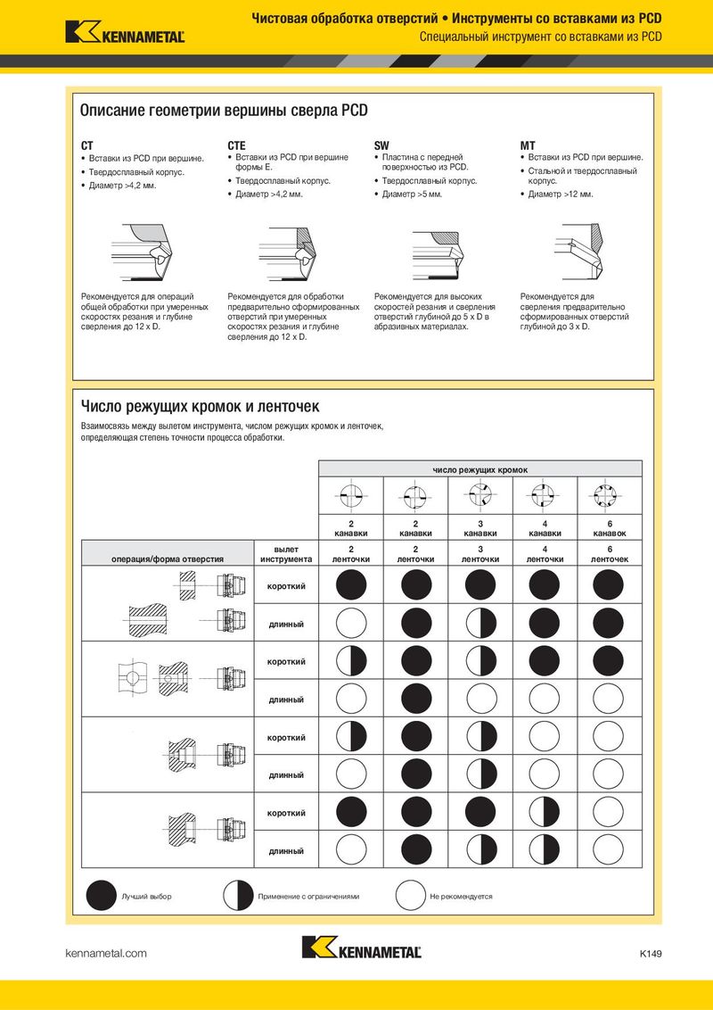 Чистовая обработка отверстий • Инструменты со вставками из PCD Специальный инструмент со вставками из PCD Описание геометрии вершины сверла PCD CT CTE SW MT • Вставки из PCD при вершине. • Вставки из PCD при вершине • Пластина с передней • Вставки из PCD при вершине. • Твердосплавный корпус. формы E. поверхностью из PCD. • Стальной и твердосплавный • Диаметр >4,2 мм. • Твердосплавный корпус. • Твердосплавный корпус. корпус. • Диаметр >4,2 мм. • Диаметр >5 мм. • Диаметр >12 мм. Рекомендуется для операций Рекомендуется для обработки Рекомендуется для высоких Рекомендуется для общей обработки при умеренных предварительно сформированных скоростей резания и сверления сверления предварительно скоростях резания и глубине отверстий при умеренных отверстий глубиной до 5 x D в сформированных отверстий сверления до 12 x D. скоростях резания и глубине абразивных материалах. глубиной до 3 x D. сверления до 12 x D. Число режущих кромок и ленточек Взаимосвязь между вылетом инструмента, числом режущих кромок и ленточек, определяющая степень точности процесса обработки. число режущих кромок 2 2 3 4 6 канавки канавки канавки канавки канавок вылет 2 2 3 4 6 операция/форма отверстия инструмента ленточки ленточки ленточки ленточки ленточек короткий длинный короткий длинный короткий длинный короткий длинный Лучший выбор Применение с ограничениями Не рекомендуется kennametal.com K149