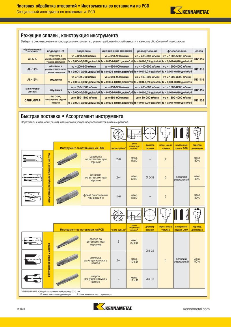 Чистовая обработка отверстий • Инструменты со вставками из PCD Специальный инструмент со вставками из PCD Режущие сплавы, конструкция инструмента Выберите режимы резания и конструкцию инструмента с учетом требований к стабильности и качеству обработанной поверхности. обрабатываемый подвод СОЖ сверление цилиндрическое зенкование развертывание фрезерование сплав материал обработка в vc = 350–600 м/мин vc = 650–900 м/мин vc = 400–900 м/мин vc = 1500–5000 м/мин AI <7% условиях масляного KD1415 тумана, эмульсия fz = 0,004–0,016 дюйм/об fz = 0,004–0,031 дюйм/об fz = 0,004–0,016 дюйм/об fz = 0,004–0,010 дюйм/об обработка в vc = 200–800 м/мин vc = 650–900 м/мин vc = 400–600 м/мин vc = 1500–4000 м/мин AI <12% условиях масляного KD1415 тумана, эмульсия fz = 0,004–0,016 дюйм/об fz = 0,004–0,010 дюйм/об fz = 0,004–0,010 дюйм/об fz = 0,004–0,010 дюйм/об vc = 100–700 м/мин vc = 650–900 м/мин vc = 400–600 м/мин vc = 1500–3000 м/мин AI >12% эмульсия fz = 0,004–0,012 дюйм/об fz = 0,004–0,010 дюйм/об fz = 0,004–0,010 дюйм/об fz = 0,004–0,010 дюйм/об KD1415 магниевые vc = 350–1000 м/мин vc = 650–900 м/мин vc = 400–600 м/мин vc = 1500–6000 м/мин сплавы эмульсия fz = 0,004–0,016 дюйм/об fz = 0,004–0,010 дюйм/об fz = 0,004–0,010 дюйм/об fz = 0,004–0,010 дюйм/об KD1415 без СОЖ, vc = 350–1800 м/мин vc = 650–900 м/мин vc = 60–200 м/мин vc = 1500–4000 м/мин CFRP, GFRP охлаждение струей KD1425 воздуха fz = 0,004–0,010 дюйм/об fz = 0,004–0,010 дюйм/об fz = 0,004–0,010 дюйм/об fz = 0,004–0,010 дюйм/об Быстрая поставка • Ассортимент инструмента Обратитесь к нам, если данная специальная услуга предоставляется в вашем регионе. длина диаметр макс. число внутренний перепад Инструмент со вставками из PCD число зубьев1 стружечной канавки2 резания уступов подвод СОЖ диаметров отсутствие режущей кромки у центра развертка макс. макс. со вставками при 2–6 5xD – 2 50% вершине зенковка макс. осевой и макс. со вставками при 2–4 5xD Ø 6–32 3 радиальный 40% вершине фреза со вставками 1–6 макс. – 2 макс. при вершине 5xD 50% длина диаметр макс. число внутренний перепад Инструмент со вставками из PCD число зубьев1 стружечной канавки2 резания уступов подвод СОЖ диаметров сверло со макс. режущая кромка у центра вставками при 2 20 x D вершине Ø 5–32 зенковка, макс. 3 осевой и макс. режущая кромка у 2–4 10 x D радиальный 50% центра сверло, макс. режущая кромка у 2 12 x D Ø 5–12 центра ПРИМЕЧАНИЕ. Общий максимальный размер 310 мм. 1 В зависимости от диаметра. 2 На основании макс. диаметра. K150 kennametal.com