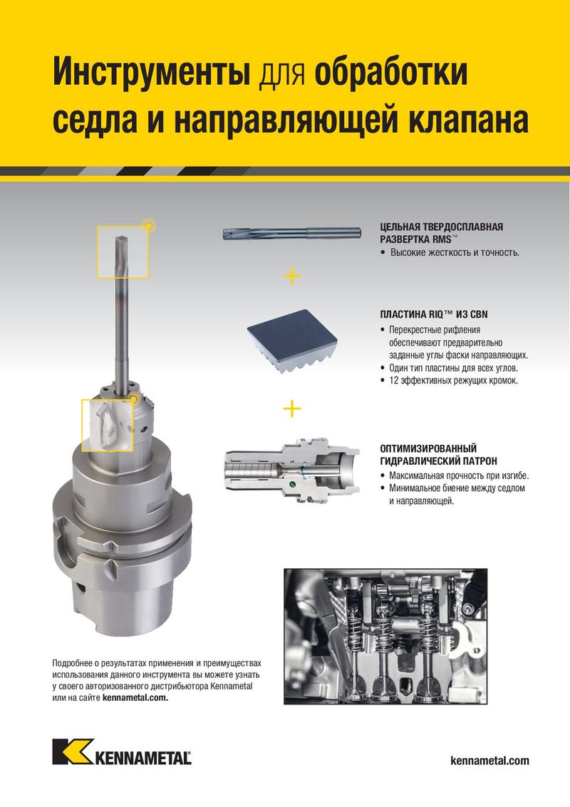 Инструменты для обработки седла и направляющей клапана ЦЕЛЬНАЯ ТВЕРДОСПЛАВНАЯ РАЗВЕРТКА RMS™ • Высокие жесткость и точность. + ПЛАСТИНА RIQ™ ИЗ CBN • Перекрестные рифления обеспечивают предварительно заданные углы фаски направляющих. • Один тип пластины для всех углов. • 12 эффективных режущих кромок. + ОПТИМИЗИРОВАННЫЙ ГИДРАВЛИЧЕСКИЙ ПАТРОН • Максимальная прочность при изгибе. • Минимальное биение между седлом и направляющей. Подробнее о результатах применения и преимуществах использования данного инструмента вы можете узнать у своего авторизованного дистрибьютора Kennametal или на сайте kennametal.com. kennametal.com