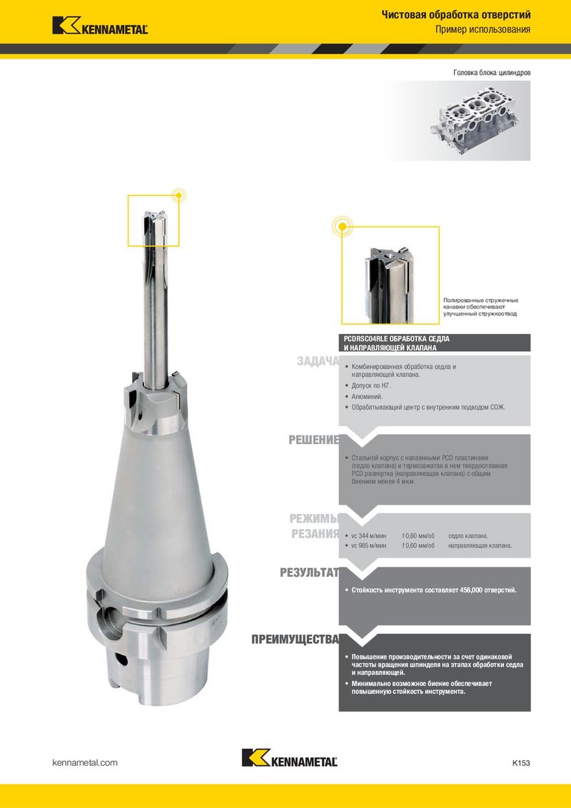 Чистовая обработка отверстий Пример использования Головка блока цилиндров Полированные стружечные канавки обеспечивают улучшенный стружкоотвод PCDRSC04RLE ОБРАБОТКА СЕДЛА И НАПРАВЛЯЮЩЕЙ КЛАПАНА ЗАДАЧА • Комбинированная обработка седла и направляющей клапана. • Допуск по H7. • Алюминий. • Обрабатывающий центр с внутренним подводом СОЖ. РЕШЕНИЕ • Стальной корпус с напаянными PCD пластинами (седло клапана) и термозажатая в нем твердосплавная PCD развертка (направляющая клапана) с общим биением менее 4 мкм. РЕЖИМЫ РЕЗАНИЯ • vc 344 м/мин f 0,60 мм/об седло клапана. • vc 985 м/мин f 0,60 мм/об направляющая клапана. РЕЗУЛЬТАТ • Стойкость инструмента составляет 456,000 отверстий. ПРЕИМУЩЕСТВА • Повышение производительности за счет одинаковой частоты вращения шпинделя на этапах обработки седла и направляющей. • Минимально возможное биение обеспечивает повышенную стойкость инструмента. kennametal.com K153