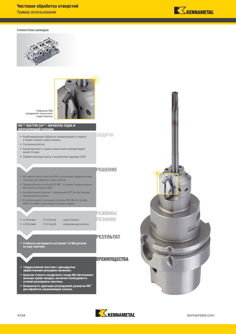 Чистовая обработка отверстий Пример использования Головка блока цилиндров Рифления RIQ определяют конусность седла клапана RIQ™ QUATTRO CUT™ ОБРАБОТКА СЕДЛА И НАПРАВЛЯЮЩЕЙ КЛАПАНА • Комбинированная обработка направляющей и первого ЗАДАЧА и второго конуса седла клапана. • Спеченный металл. • Концентричность седла относительно направляющей менее 50 мкм. • Обрабатывающий центр с внутренним подводом СОЖ. РЕШЕНИЕ • Инструментальная оснастка RIQ с встроенным гидравлическим патроном для обработки седла клапана. • Твердосплавные пластины RIQ K68™ и цельная твердосплавная многозубая развертка RMS™. • Альтернативное решение с соединением KST для достижения повышенной жесткости. • В наличии имеются режущие пластины RIQ CBN из сплавов KBHK10 и KBHK15 для обработки седла клапана. РЕЖИМЫ • vc 80 м/мин f 0,10 мм/об седло клапана. РЕЗАНИЯ • vc 80 м/мин f 0,32 мм/об направляющая клапана. РЕЗУЛЬТАТ • Стойкость инструмента составляет 12 000 деталей на одну пластину. ПРЕИМУЩЕСТВА • Твердосплавная пластина с двенадцатью эффективными режущими кромками. • Высокая точность посадочного гнезда RIQ обеспечивает меньшее время наладки, исключая необходимость угловой регулировки пластины. • Возможность адаптации регулируемой развертки RIR™ для обработки направляющей клапана. K154 kennametal.com